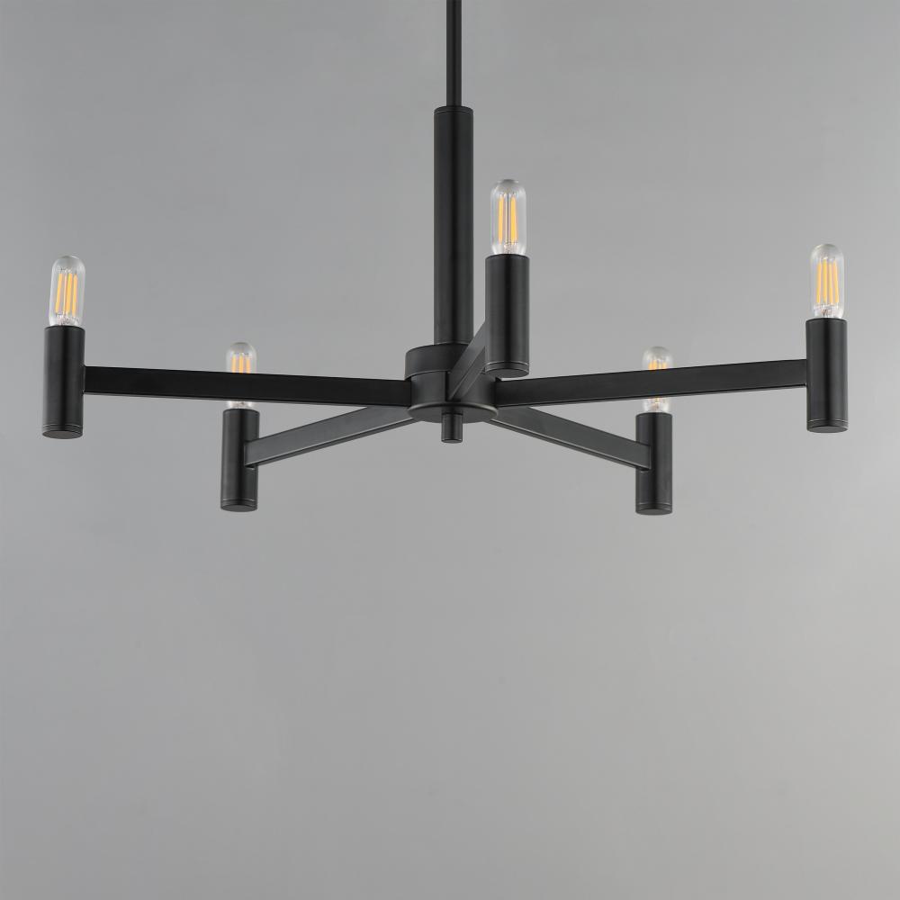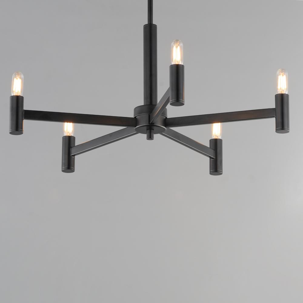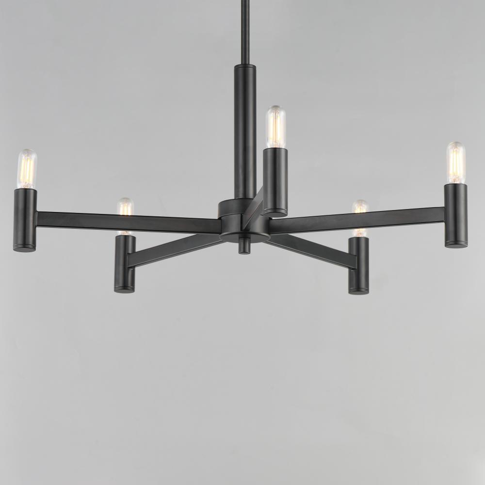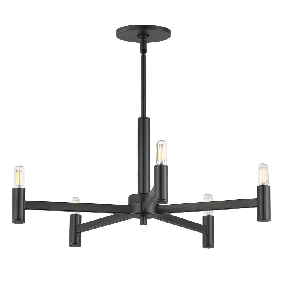 Straight extensions of rectilinear arms emanate from a cylindrical center housing in this transitional design. The candelabra is made in a corresponding cylindrical form playing into the geometries of this streamlined chandelier design. Available in a text