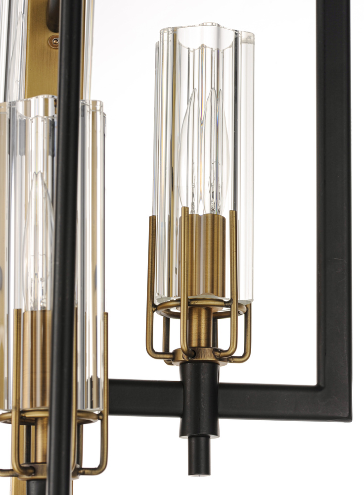 Dramatic and opulent, light sources shine through exquisite Clear scalloped glass hurricane shades as they seemingly float on unique metal prongs finished in Antique Brass. The brass accents are contrasted with a Black frame configured in cascading pendant