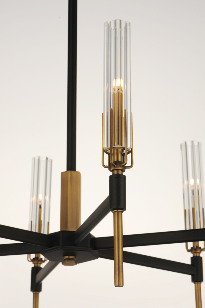 Dramatic and opulent, light sources shine through exquisite Clear scalloped glass hurricane shades as they seemingly float on unique metal prongs finished in Antique Brass. The brass accents are contrasted with a Black frame configured in cascading pendant