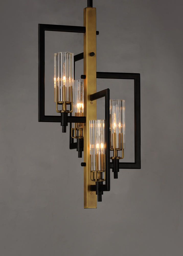 Dramatic and opulent, light sources shine through exquisite Clear scalloped glass hurricane shades as they seemingly float on unique metal prongs finished in Antique Brass. The brass accents are contrasted with a Black frame configured in cascading pendant