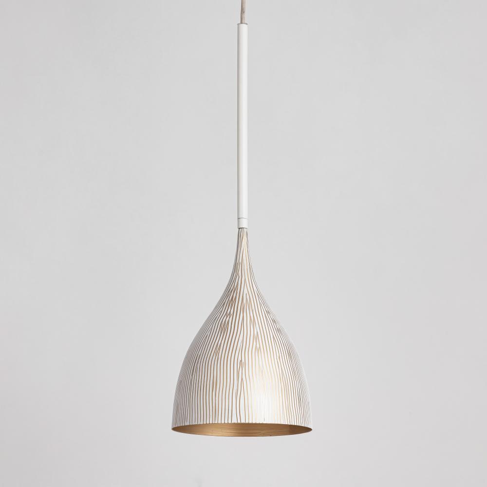 Graceful and sculptural, Fleur's gently flared silhouette brings a sense of quiet sophistication to any space. Hand-spun metal shades are adorned with a striated finish, scraped by hand to reveal glowing Gold undertones beneath layers of Matte Black or