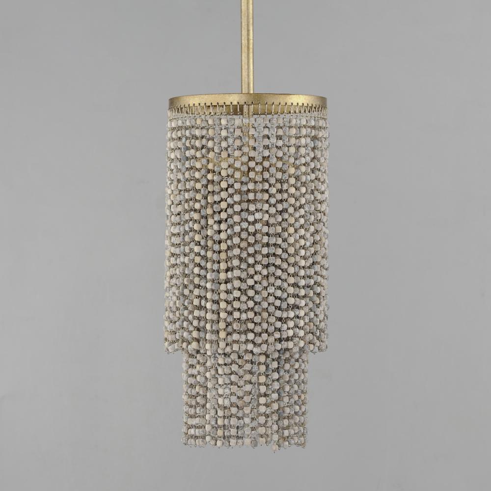 Cascading strands of square Weathered Wood beads are suspended on an offset spiraling frame finished in hand-applied Golden Silver leaf. The craftsmanship of the design is complimented by the soft glow of light within adding ambience to any space. Availabl
