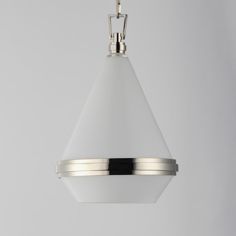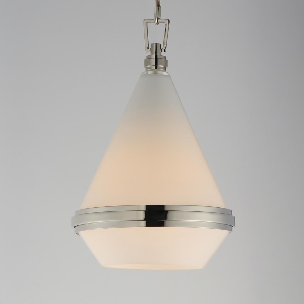 A glossy White glass shade, conical in form, is combined with sharp-lined bands of metal finished in your choice of Polished Nickel or Satin Brass to create a pyramid of softly diffused light. Squared off trapezoidal chain loops connect to squared chain li