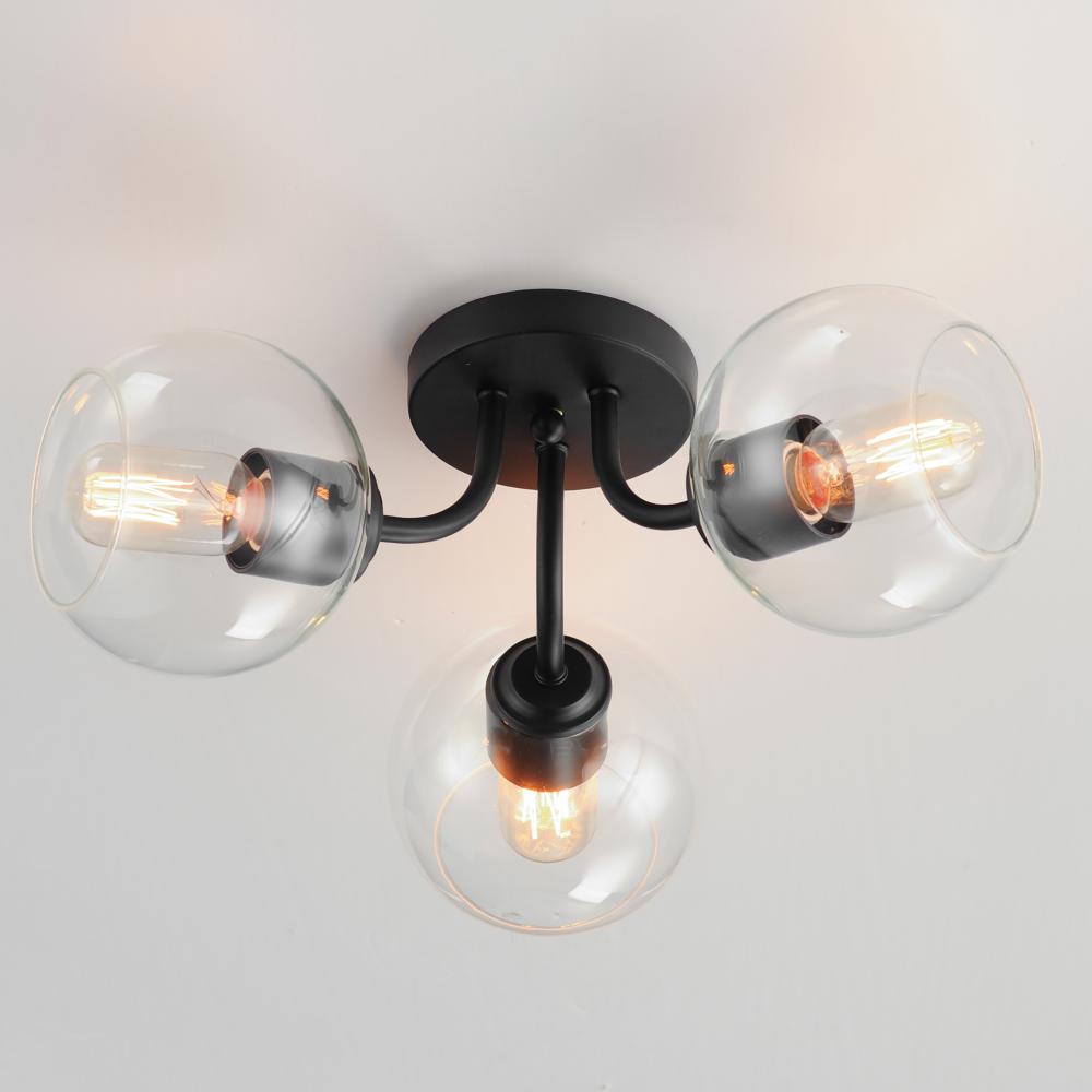 Clear glass globes on a Natural Aged Brass frame create a transitional design that is sure to please. The sloping arms level out to create a simple Mid Century Modern configuration. A full range of the products in this collection include chandeliers, penda