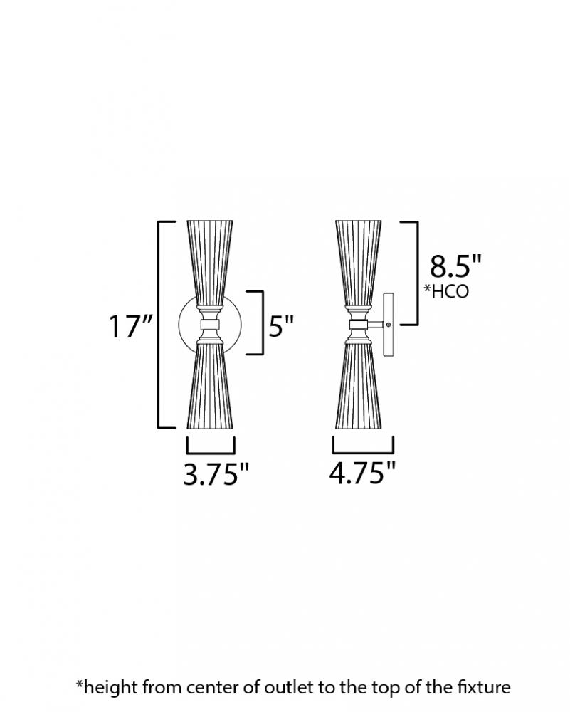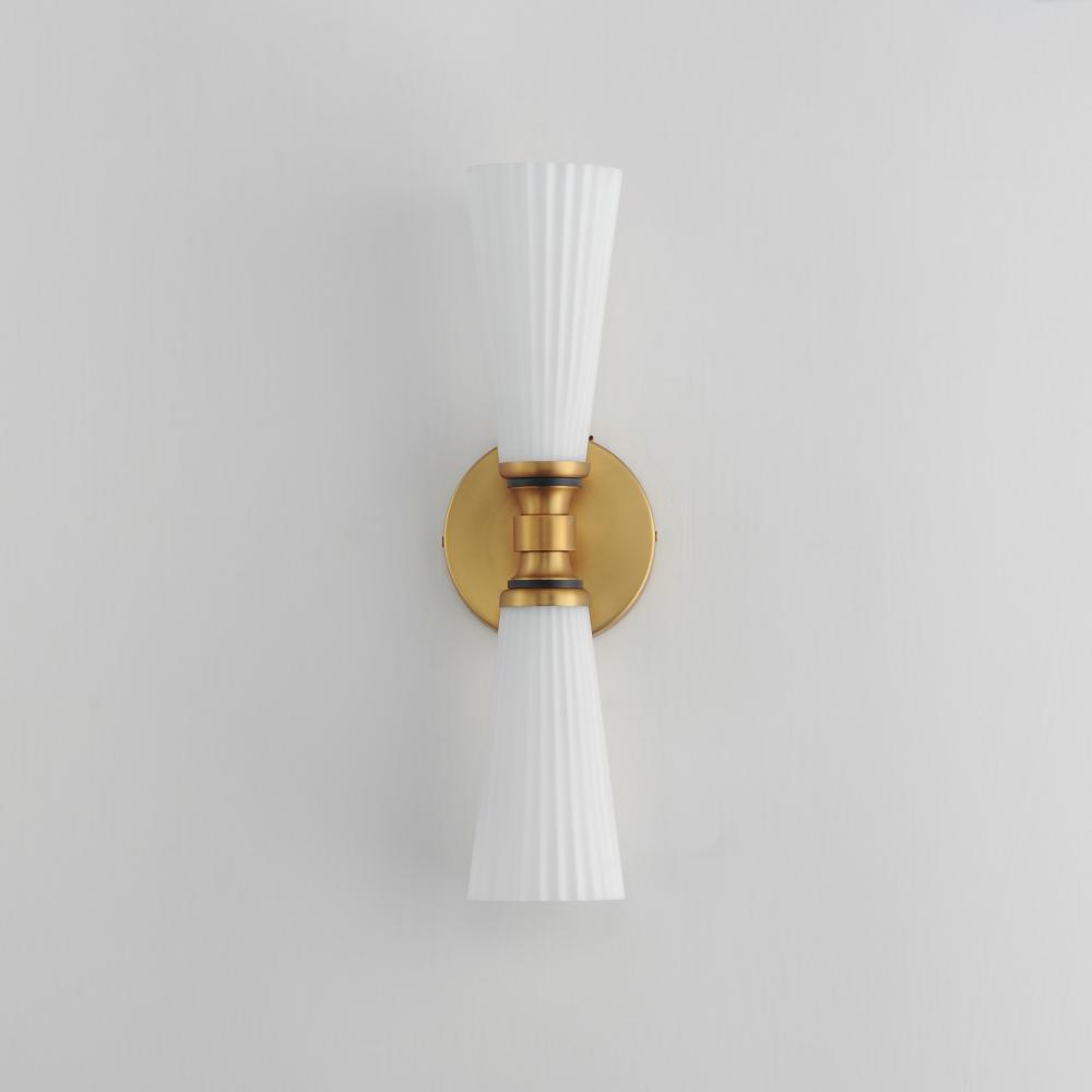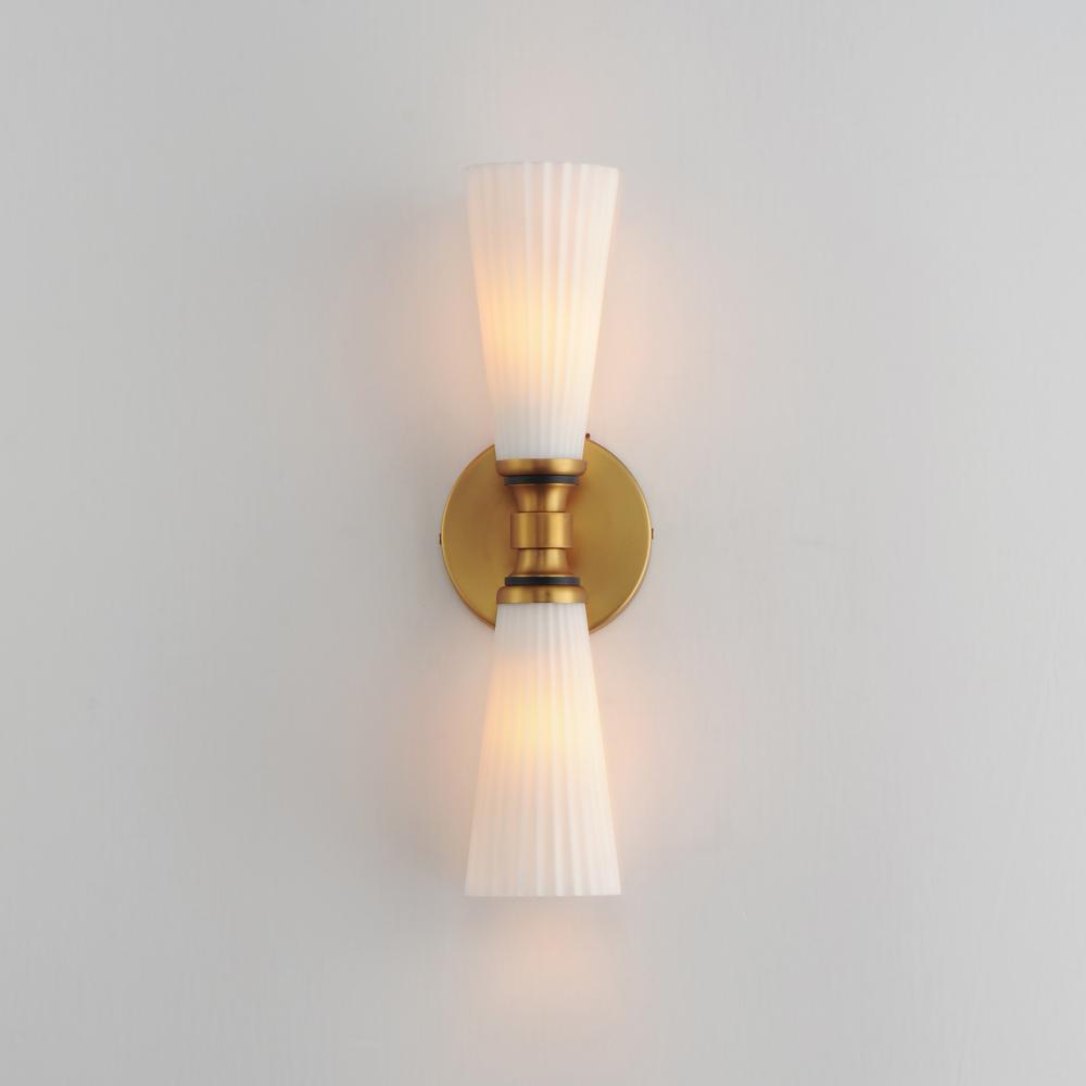 Fluted Satin White glass flares outward from an intricate and thin arm. The contrasting Natural Aged Brass and Matte Black finish adds character to the simple and stately fixtures that easily transition from modern and more traditional spaces.