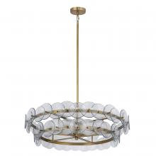 Overlapping handmade pressed glass disks mounted on metal frames inspired by Mid-Century Italian design, this collection offers a blend of vintage charm and modern elegance. Choose from Vintage Green glass on a Weathered Brass frame, or Amber glass on a Gu