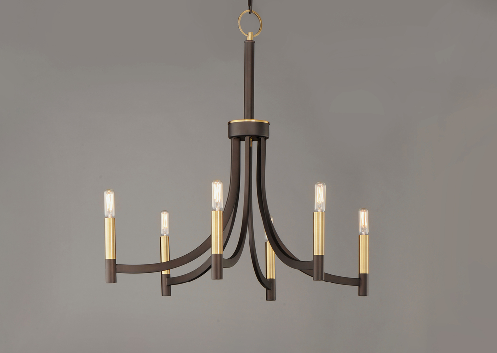 This transitional style chandelier collection features sweeping rectangular arms that transitions to a simple tubular candles. Available in Bronze with Antique Brass accents or all Satin Nickel for a more modern approach.