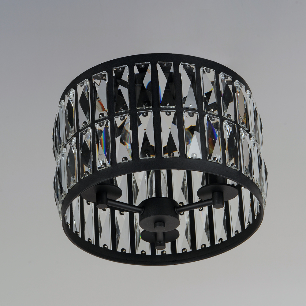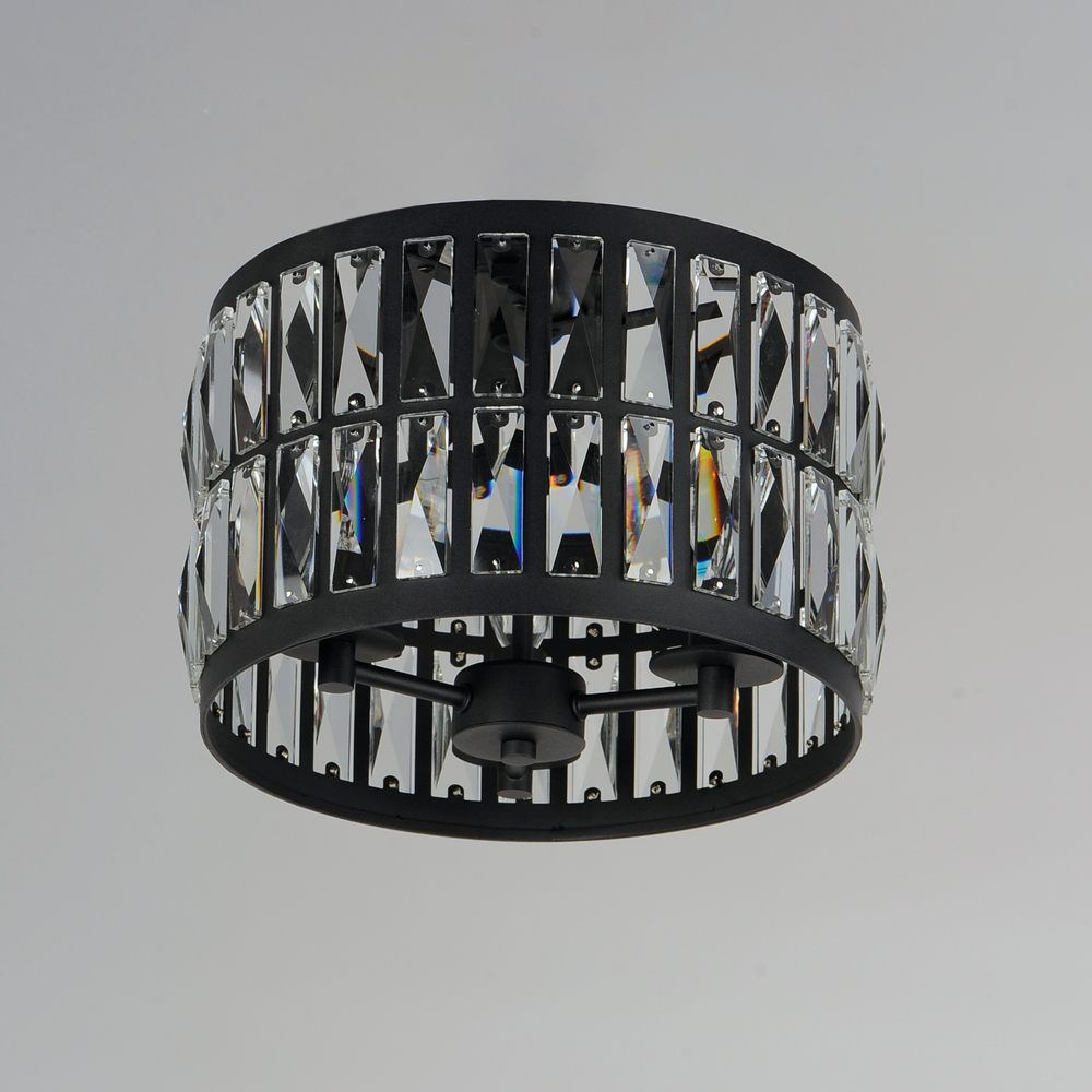 Rectilinear Beveled Crystals bejewel a Matte Black frame creates stark contrast to this radiantly prismatic display of light. The bound crystal is fixed to the frame to reduce time spent dressing the fixture.