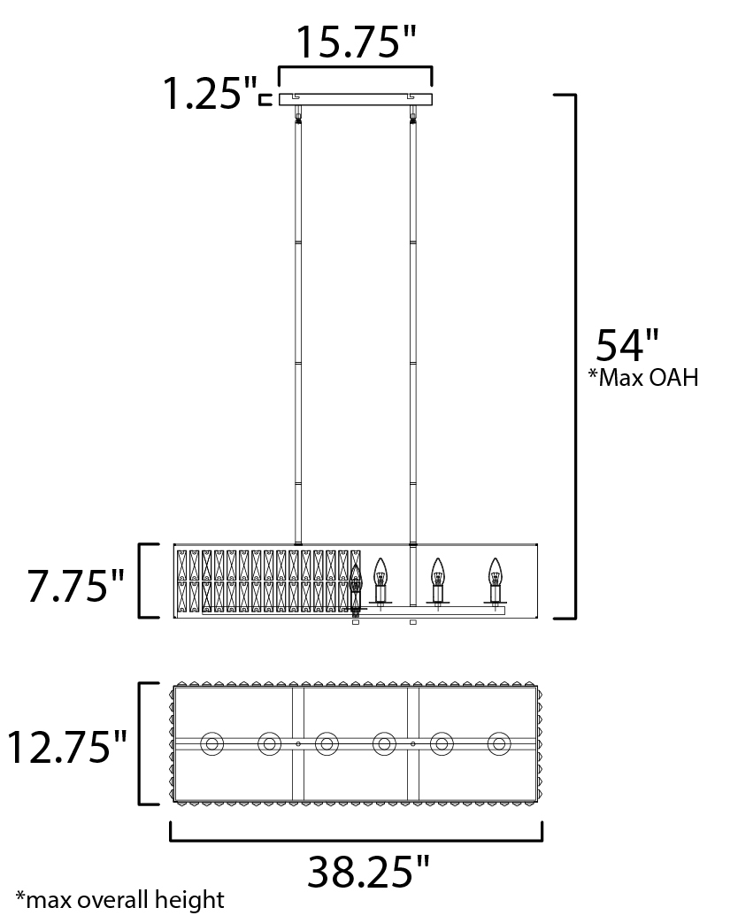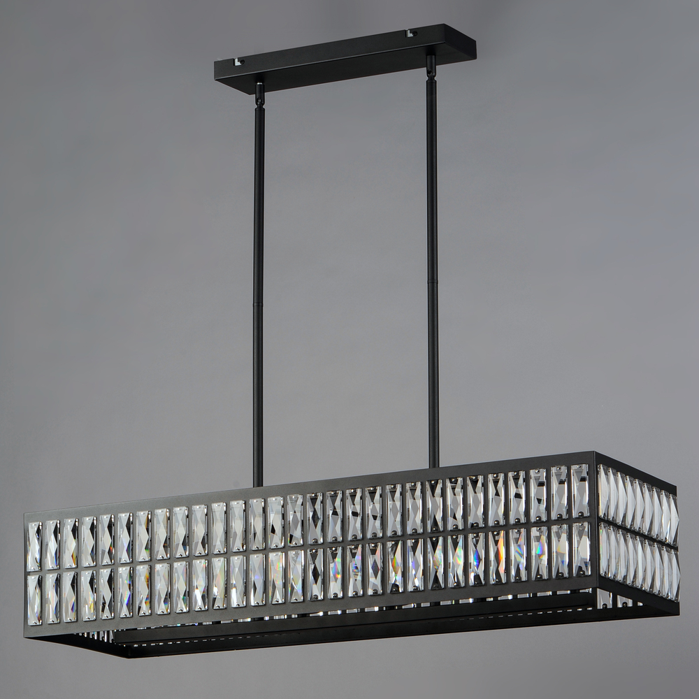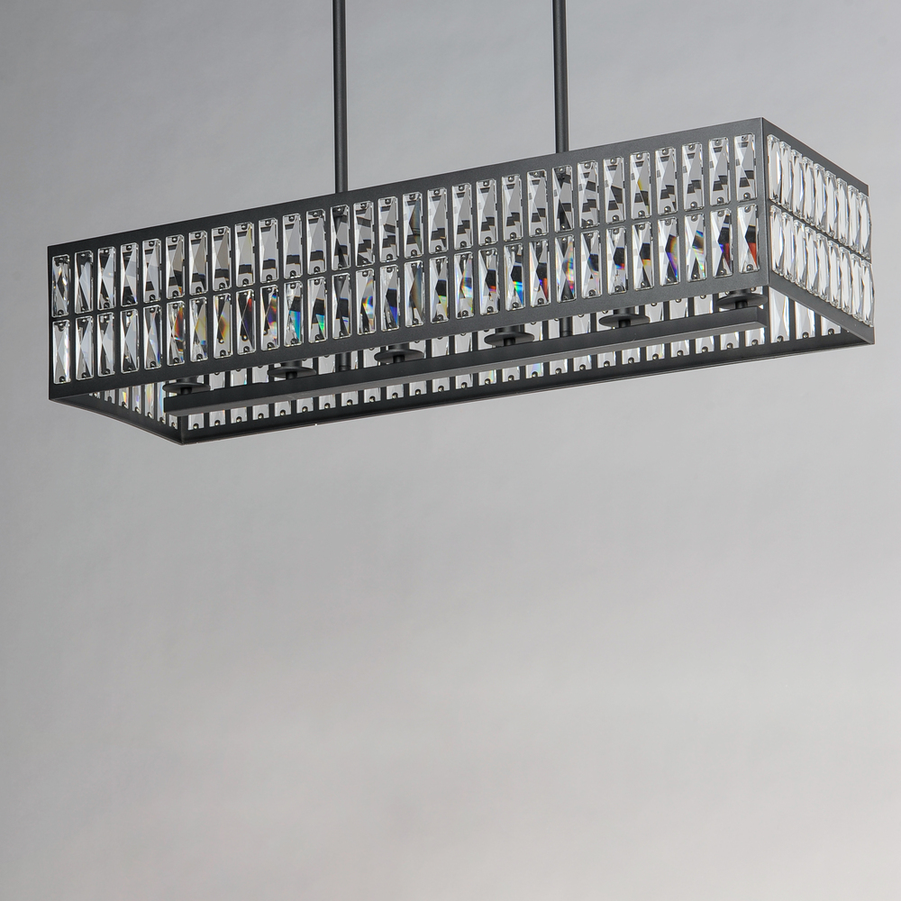 Rectilinear Beveled Crystals bejewel a Matte Black frame creates stark contrast to this radiantly prismatic display of light. The bound crystal is fixed to the frame to reduce time spent dressing the fixture.
