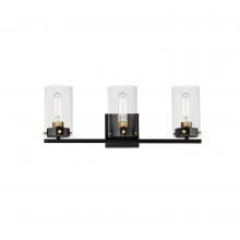 Simple clear glass cylinders are secured by decorative thumb screws in this transitional collection of sconces and pendants both neutral in design and suitable for damp applications. Choose from Satin Nickel or a two-tone Black and Satin Brass finish to pa