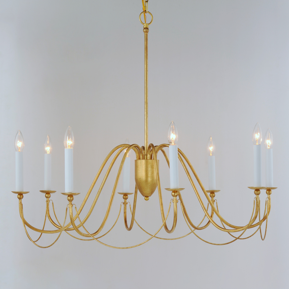 Sweeping metal accents links create classic curves on a minimalist chandelier. Available in hand-rubbed Chestnut Bronze or elegant Gold Leaf finishes. Add crystal accents to elevate the design for a more extravagant glamour. The design manages to evoke Fre