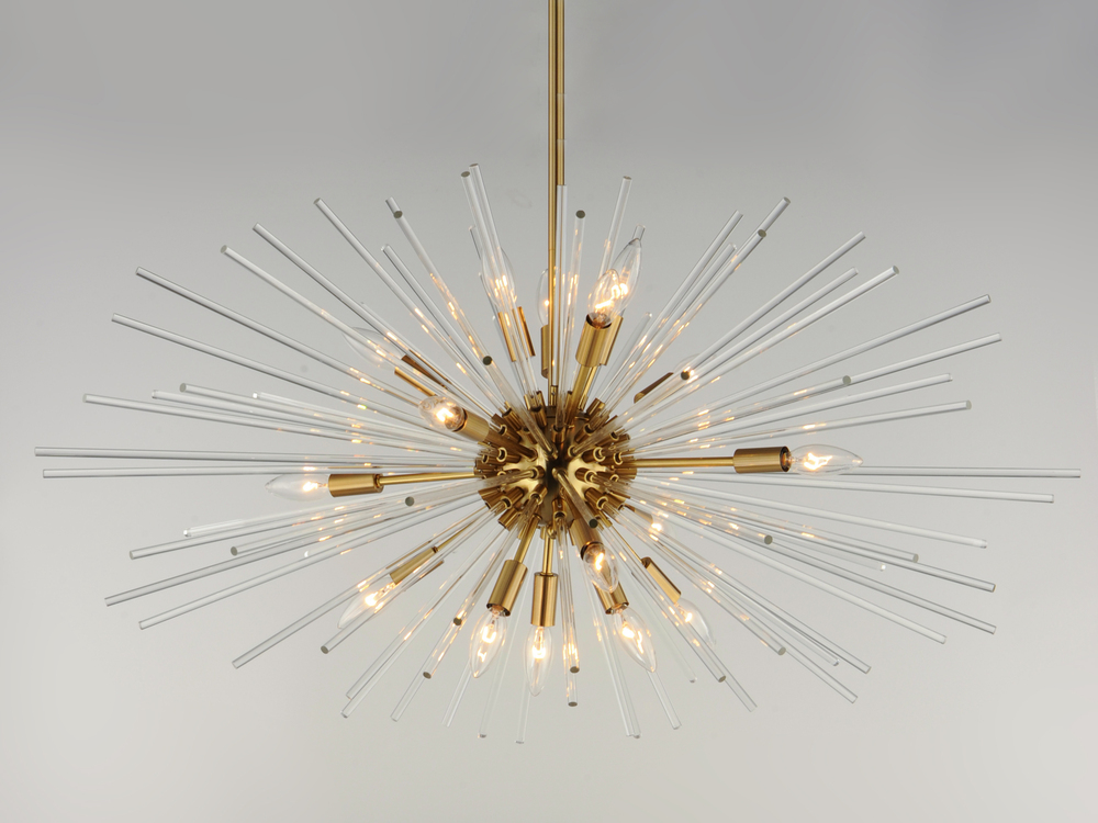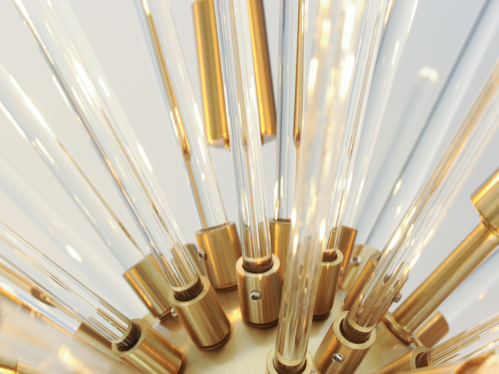 A dazzling burst of Clear glass rods extend from a classic sputnik shape finished in a bright Polished Chrome or warm Satin Brass. Available in two sizes of pendants and as a ceiling fixture, this unique look is a statement piece designed to attract attent
