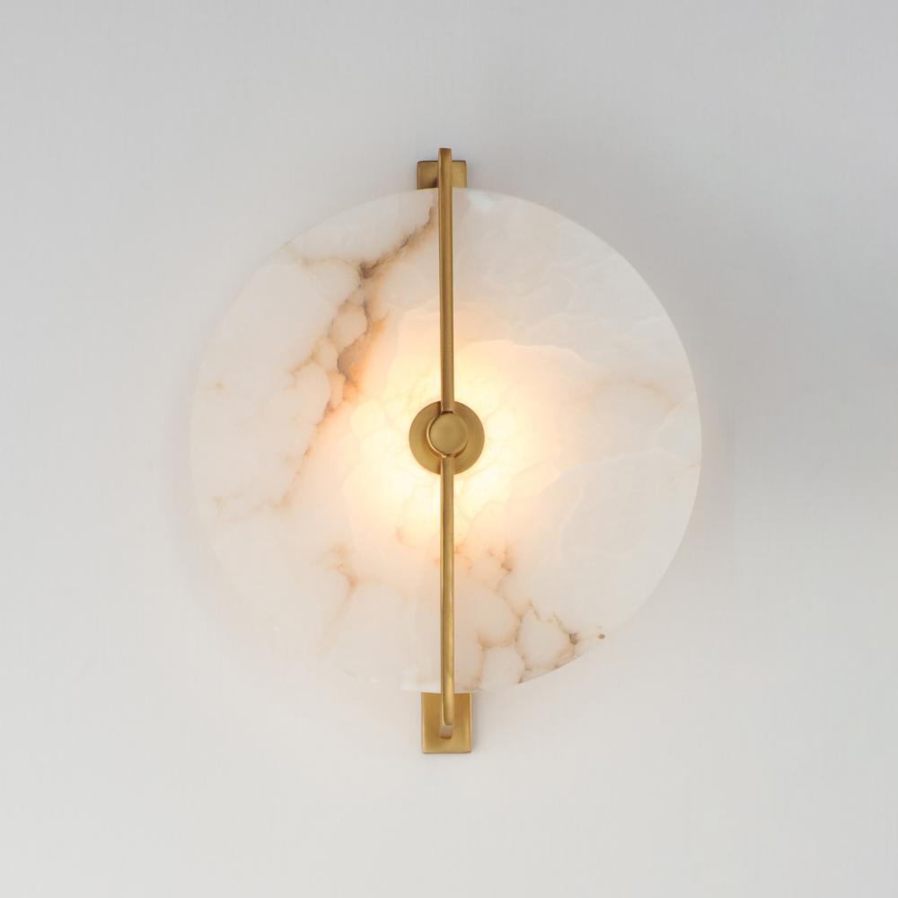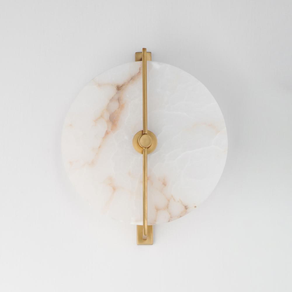 Modern in execution, the Quarry collection features natural Spanish alabaster in an iron frame finished in Darkened Bronze or Natural Aged Brass. Dedicated LED housing shine light on alabaster panels, highlighting the stone's beautiful, veined characte