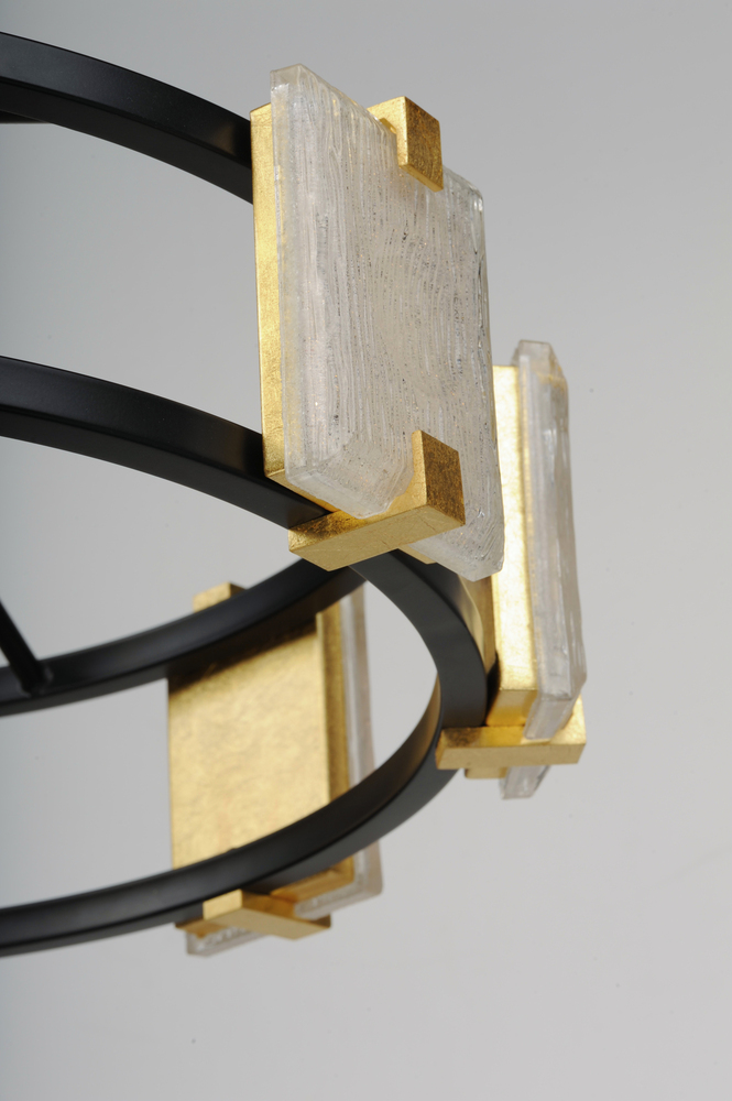 Piastra style glass diffuses integrated LED to shimmer radiantly. Suspended on a Black frame with Gold Leaf accents, this perfect blend of contemporary and traditional design adds glamour to a broad spectrum of design aesthetics.