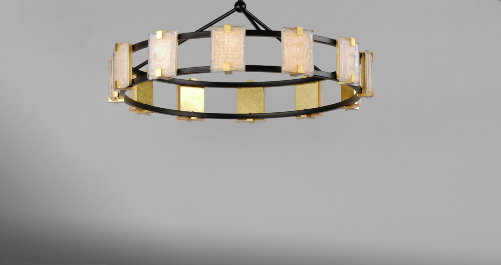 Piastra style glass diffuses integrated LED to shimmer radiantly. Suspended on a Black frame with Gold Leaf accents, this perfect blend of contemporary and traditional design adds glamour to a broad spectrum of design aesthetics.