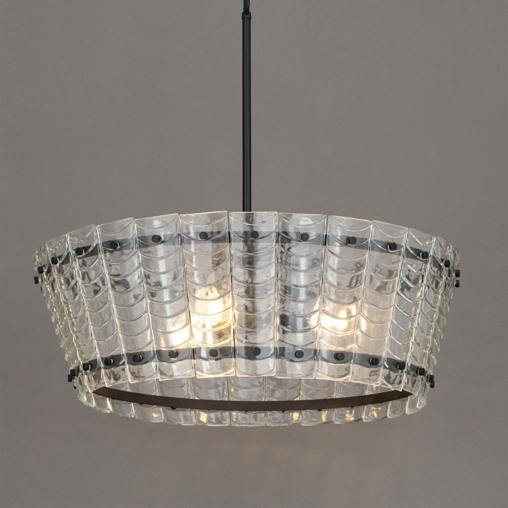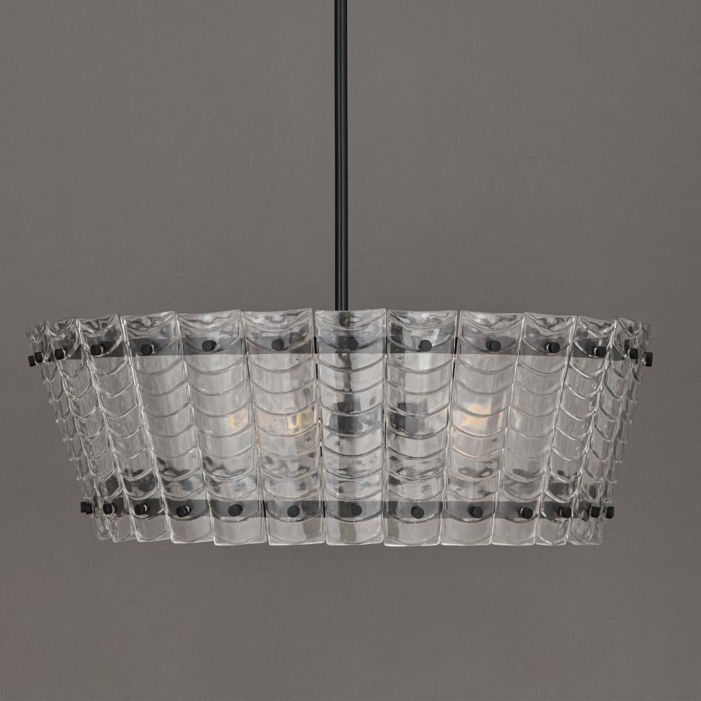 Evoking the softness of fabric through sculpted solids, thick clear cast glass panels, each with a tiered scallop motif, are gathered into tapered cone silhouette that shimmers with texture and depth. Framed in a rich Dark Bronze finish, the design feels b