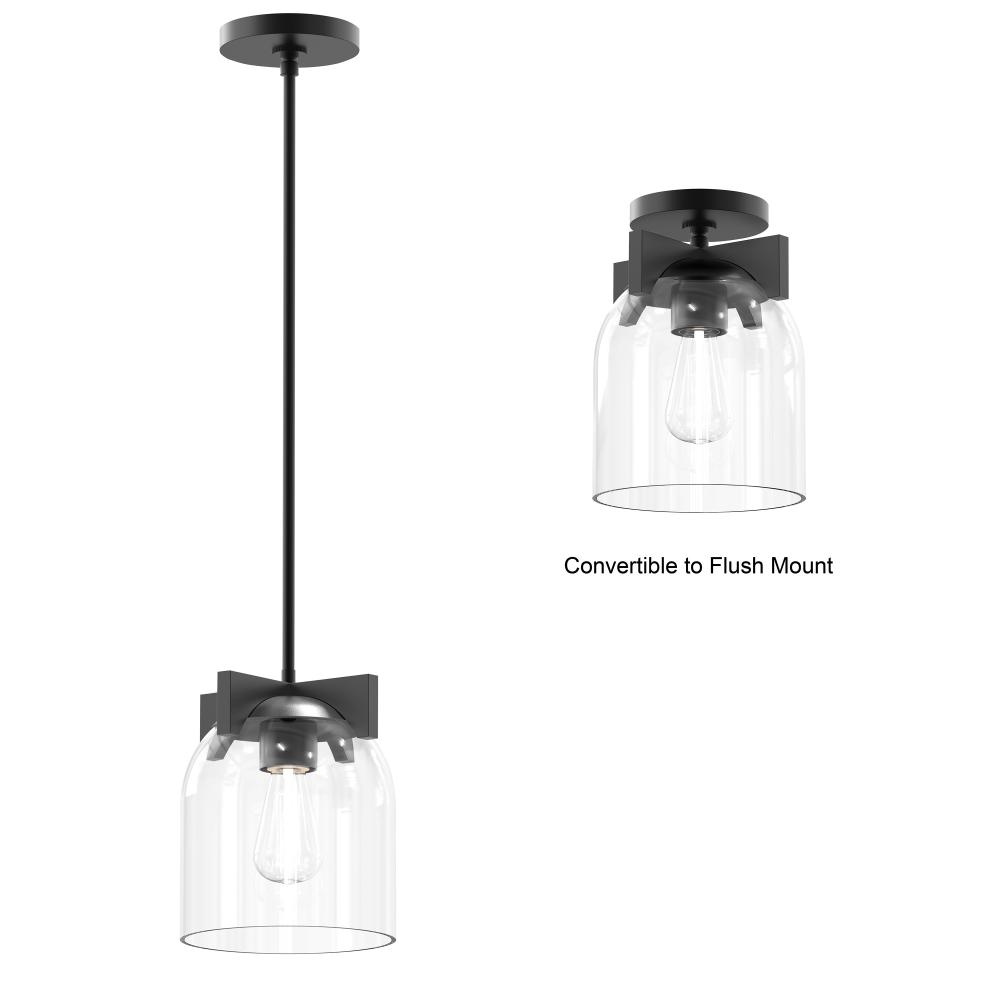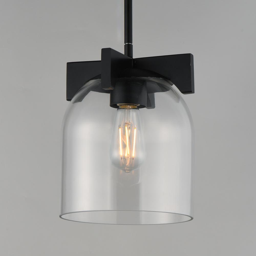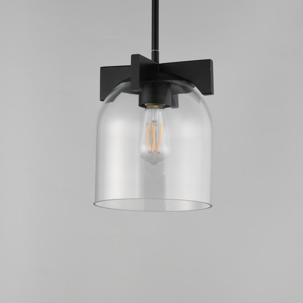 Cut-out metalwork curves around modern bell-shaped glass shades. The series includes pendants and bath vanities available in either Clear or a swirling Marble glass. Available in various complementary finishes: Polished Chrome, Matte Black, or Natural Aged