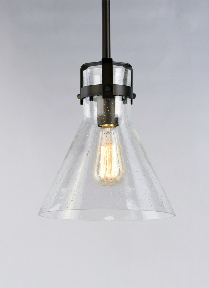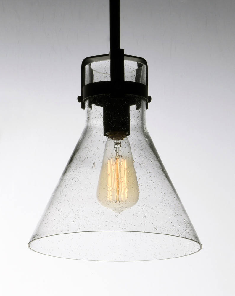 This nautical-inspired collection features Clear Seedy glass cones suspended by a yoke frame. The clear glass offers abundant lighting and compliments the styling of the fixture. Make it a more industrial look by adding filament E26 light bulbs.