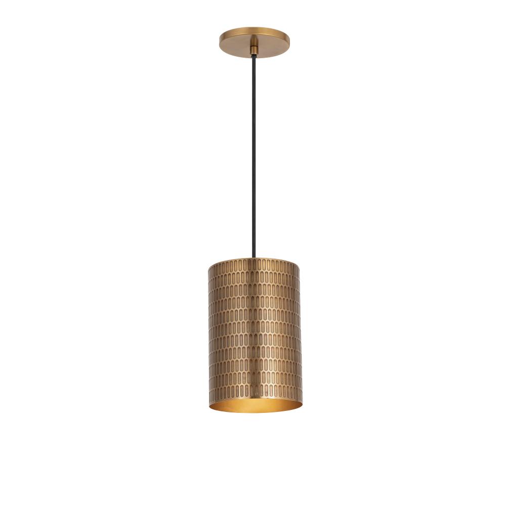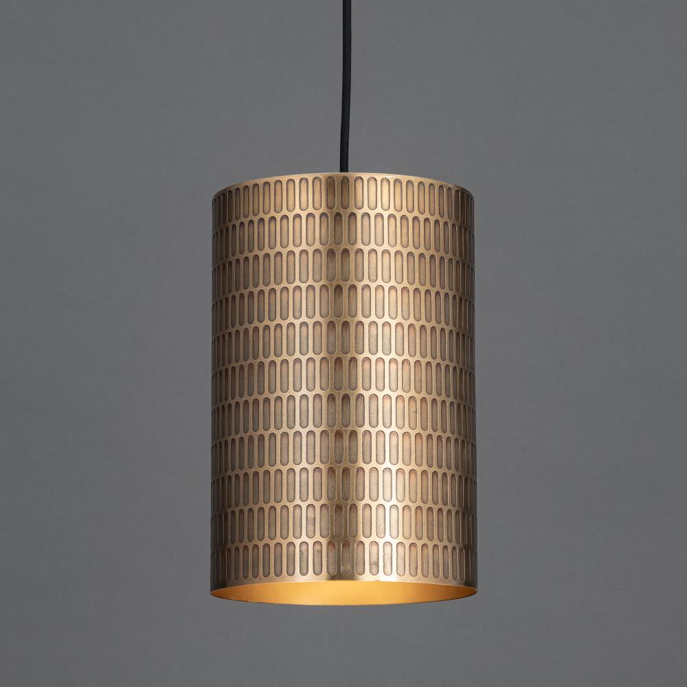 With bold geometry and a globally inspired edge, the Shaka collection makes a statement in simplicity. Each cylindrical drum shade is hand-finished in hammered metal, etched with an elongated oval pattern that adds visual rhythm and soft texture. The light