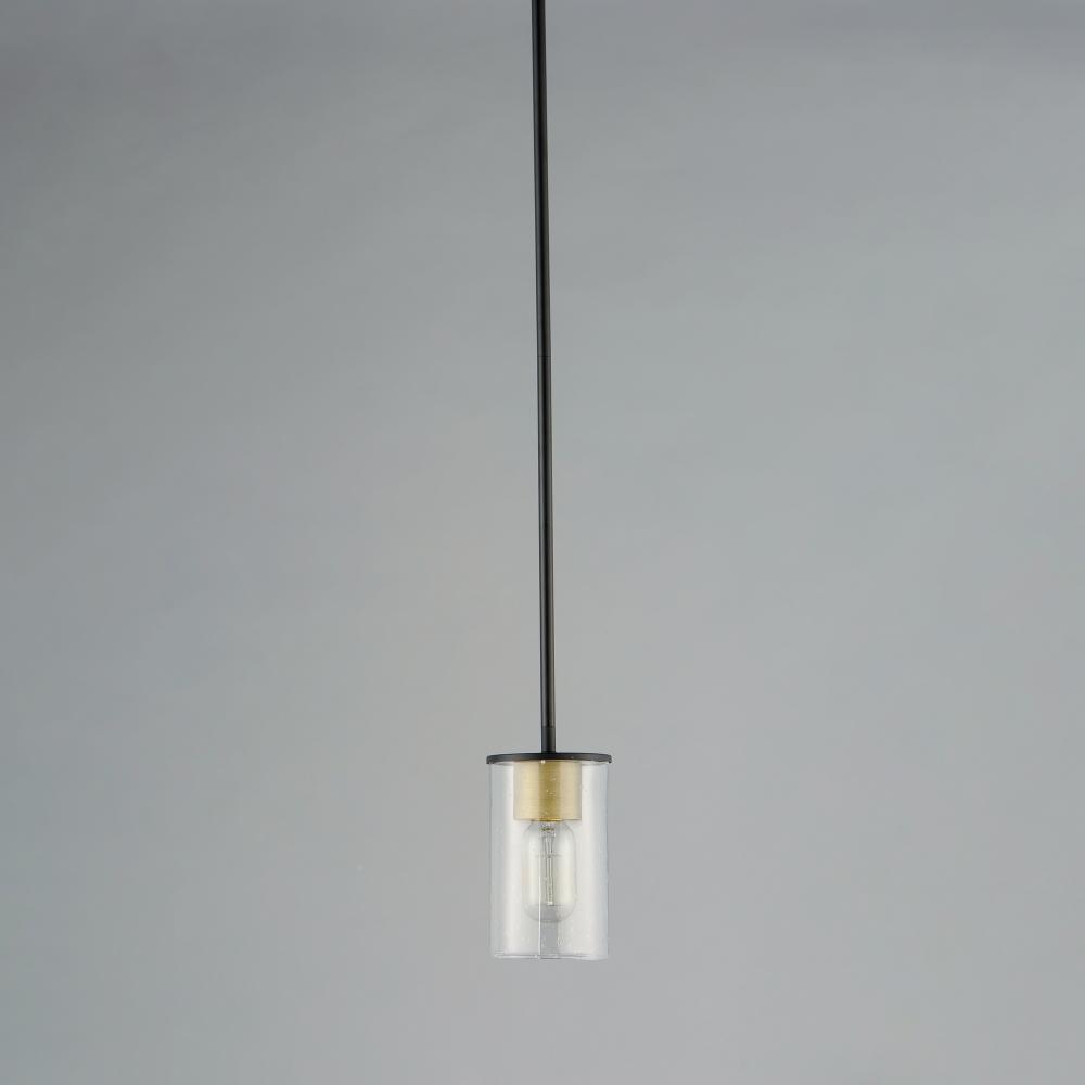 Cylinders in Clear Seeded glass on simple Satin Nickel frames or matte Black frames with Antiqued Brass socket covers. Pivoting arms on chandelier allow it to direct light up or down. Use filament lamps either tubular or Edison in shape for a Coastal or In