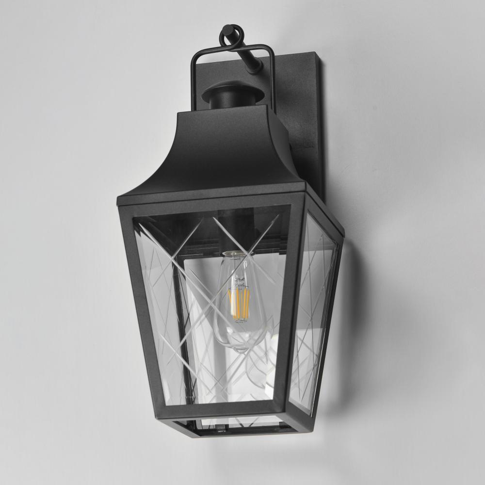 These charming cottage style lanterns feature unique cross-etched glass panels that are Clear and beveled along their edges. Additional design details such as whimsical loops above a chimney element add to the product's delightful appearance. Finished