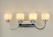 Square tube arms curve to form arcs of Polished Chrome in an interesting and unique fashion. White opal glass shades complete this clean design and provide a soft even illumination. Can be installed up or down.