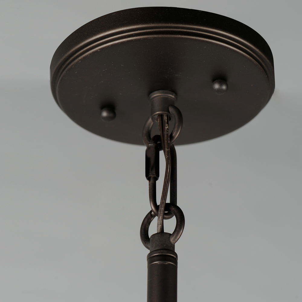 Elevate the industrial with meticulously crafted metal spun shades in Oil Rubbed Bronze with Antique Brass rivet details on matte black straps and brass hook suspension system. Light emits from both the top and bottom of the pendants as well as reveals spa