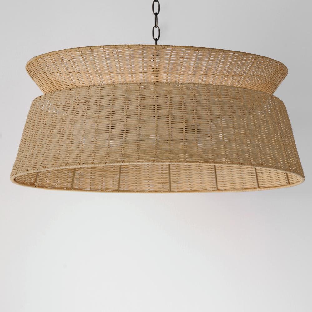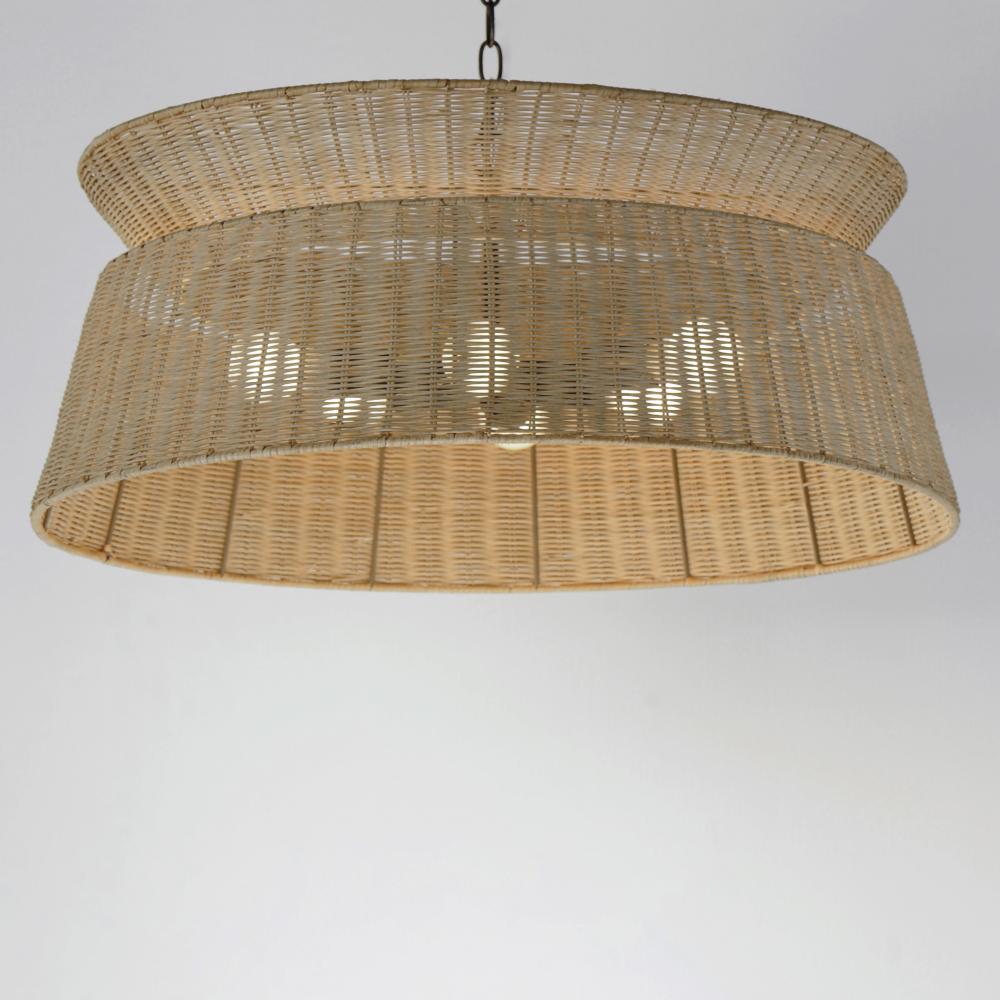 Hand-woven rattan wicker in a natural or darkened finish are shaped into a sloping drum shade with an internal fan and LED light source within them. The contrasting Dark Bronze finish of the metalwork encases an LED ring toward the bottom edge of the shade