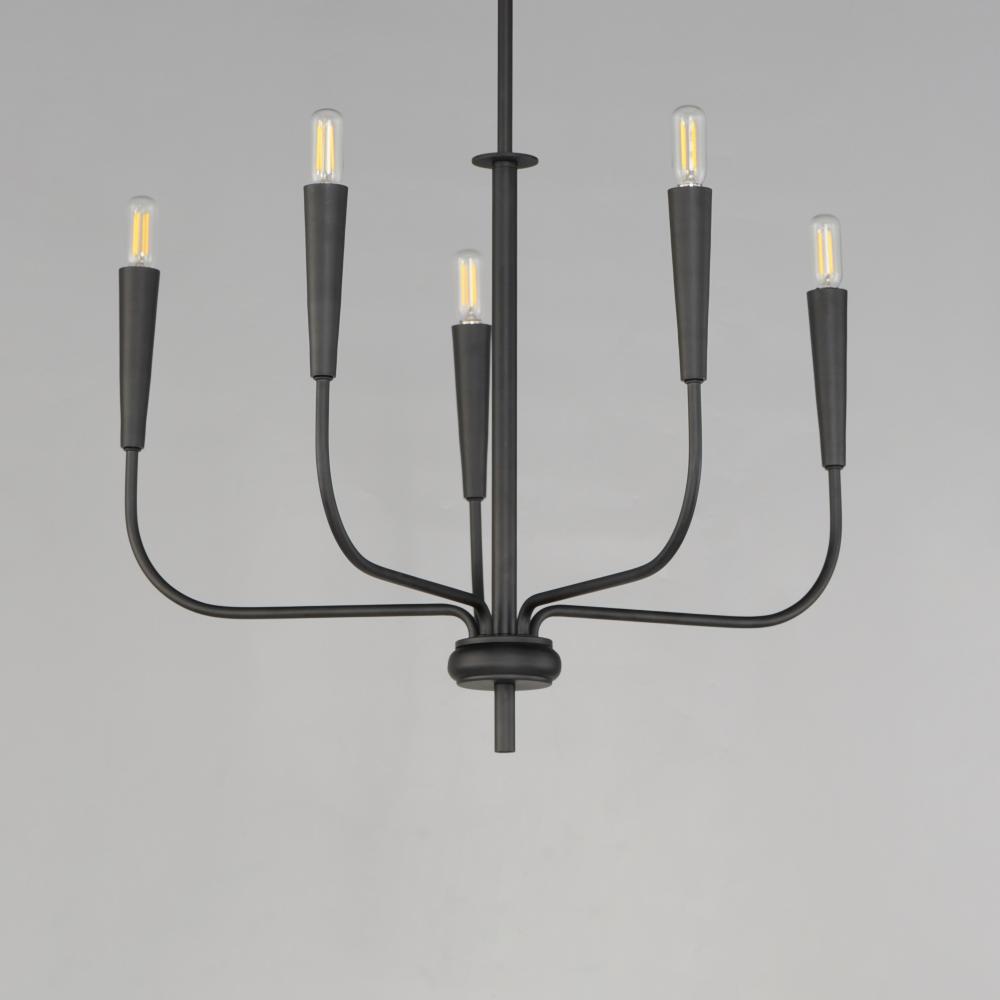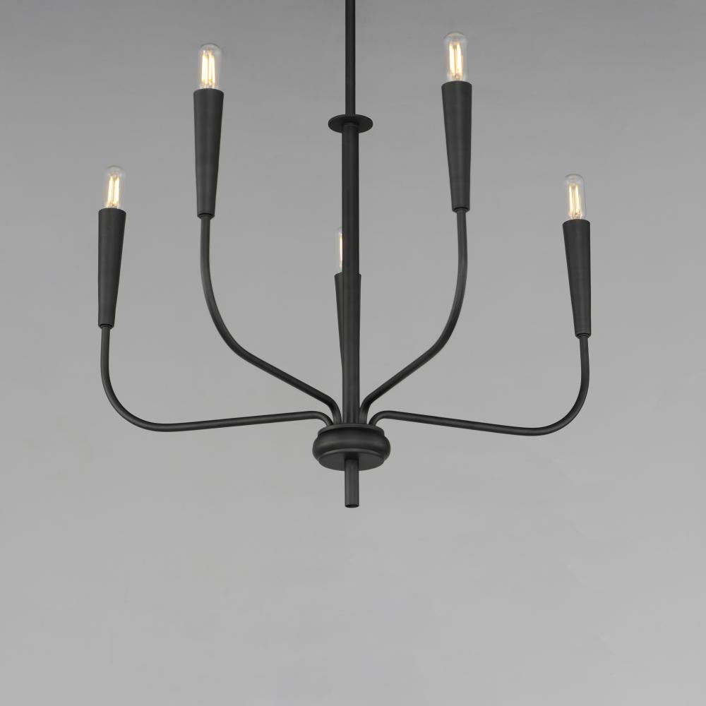 A simple candle style chandelier is given a modern edge with tall tapered candle covers that sit at the ends of curved arms without a bobeche beneath them. Available in Satin Brass or Matte Black, the collection compliments many architectural interiors and