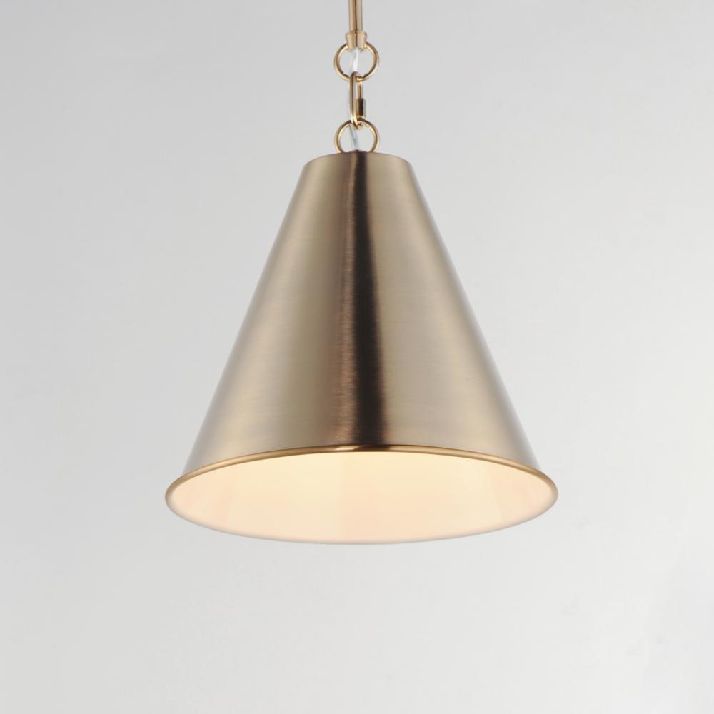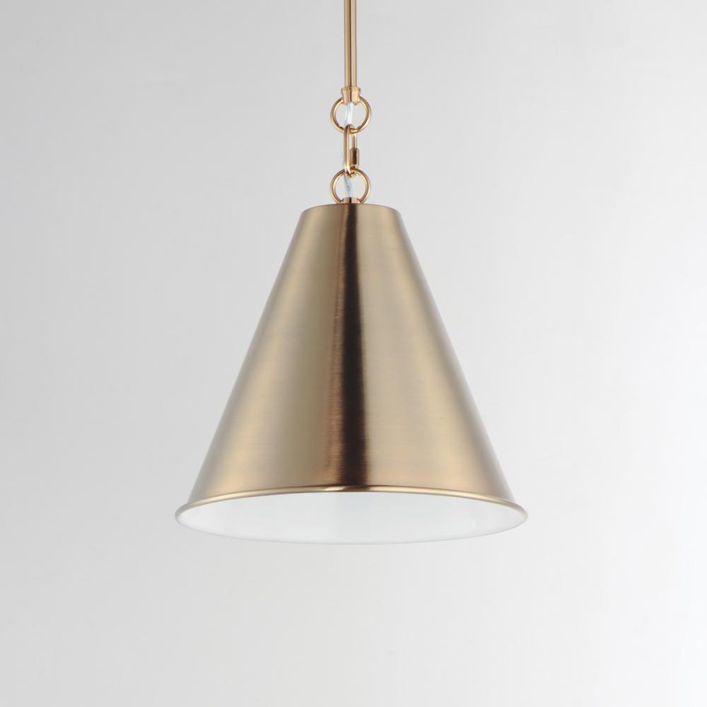 The iconic metal spun cone shade offers a transitional pendant design great as multiples over a kitchen island or dining table. Available in rich finishes including Heritage Brass, Satin Nickel, and Chestnut Bronze. All these shades are painted white on th