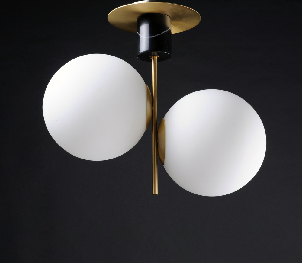 Inspired by both Mid Century Modern and Scandinavian Contemporary this collection spans a large breadth of today's interior design. Straight tubing finished in Satin Brass supports hand blown Satin White cased glass globes. Black accents of metal and B