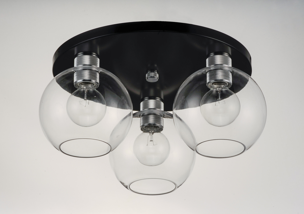 Machined and knurled sockets are finished in Brushed Aluminum which gives stark contrast to the Black round tube frames. Heavy weight Clear hand-blown glass spheres adds scale to this industrial classic.