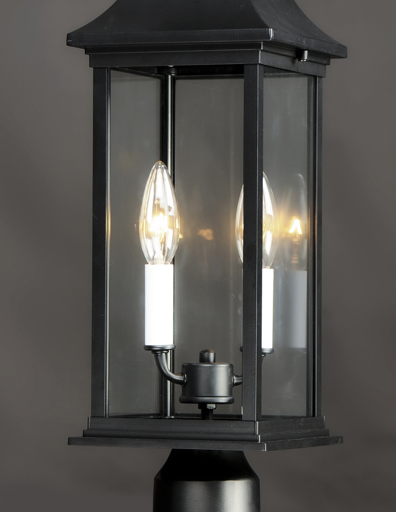 Inspired by classic coach gas lanterns, the Vicksburg collection features die-cast aluminum construction finished in Black with Clear glass. The candle sleeves are done in a contrasting off-white finish to add dimension to the lantern. Available in numerou