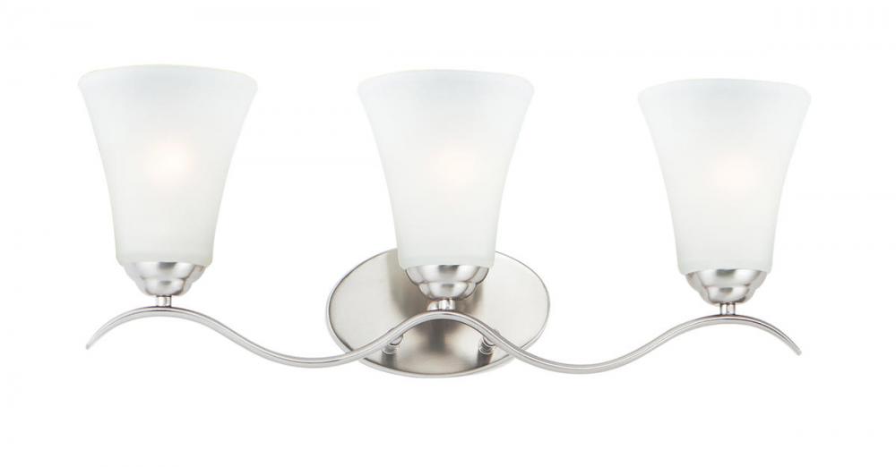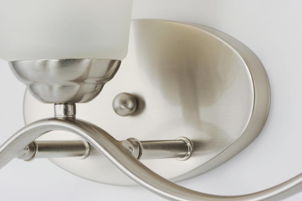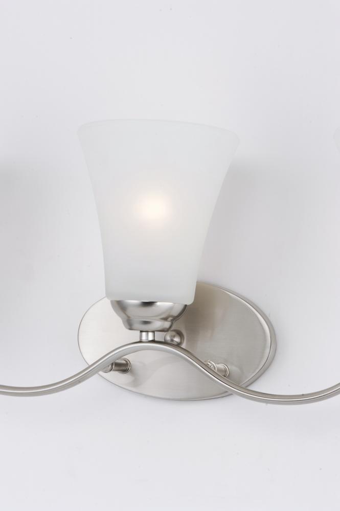 Gently waving arms of Satin Nickel or Oil Rubbed Bronze support tall-profile Frosted glass shades creating a scale normally not found in this category of lighting. The bath vanity may be installed up or down and also includes a Polished Chrome finish.