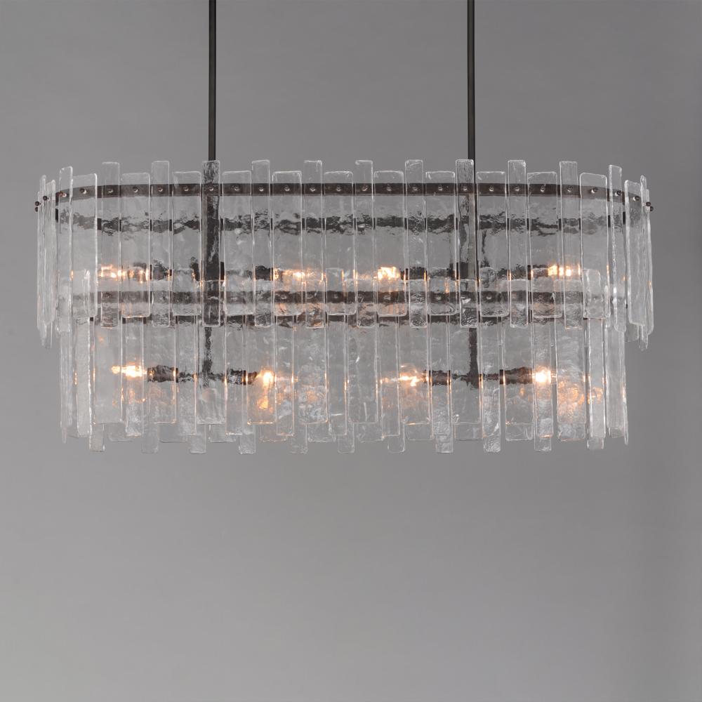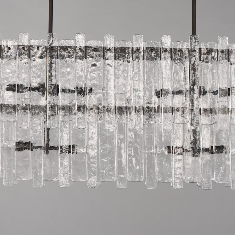 Gracefully flowing molten glass panels with uniquely organic aesthetic encircle rings of rich Darkened Bronze metal or hand-applied Gold Leaf. This refined interpretation of tiered glass pendants exudes warmth and elegance, effortlessly blending a moody am