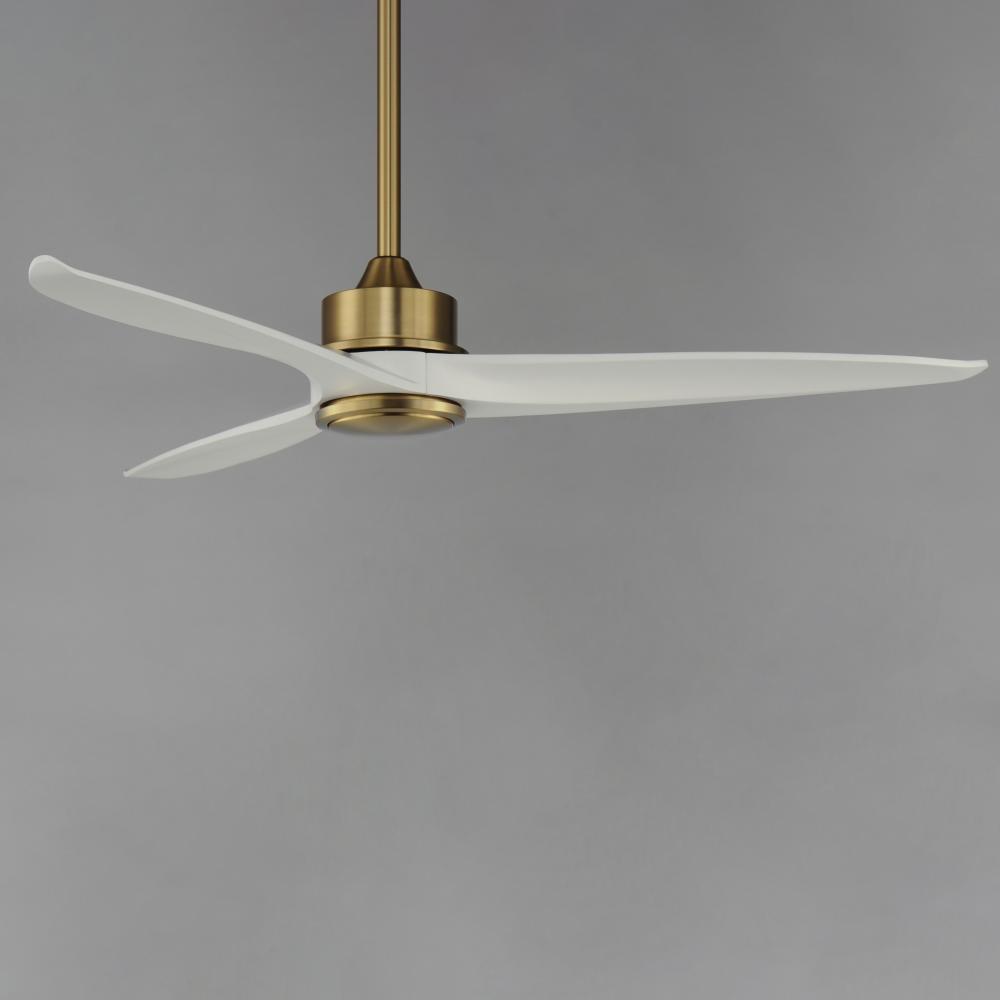 Solid Wood blades curve as they rotate around a center housing with LED light kit included. An additional cover plate is included if the light kit is not used. Select from stylish finish combinations including Natural Aged Brass with White Wood, Satin Nick