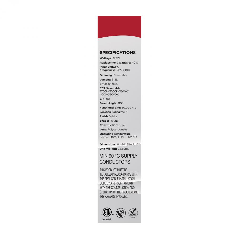 6.5 Watt; 7 Inch LED Disk Light; 27K/3K/35K/4K/5K CCT Selectable; White Finish