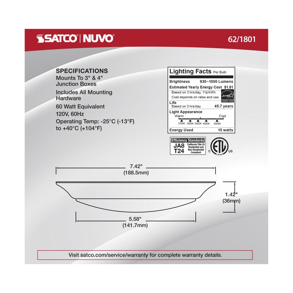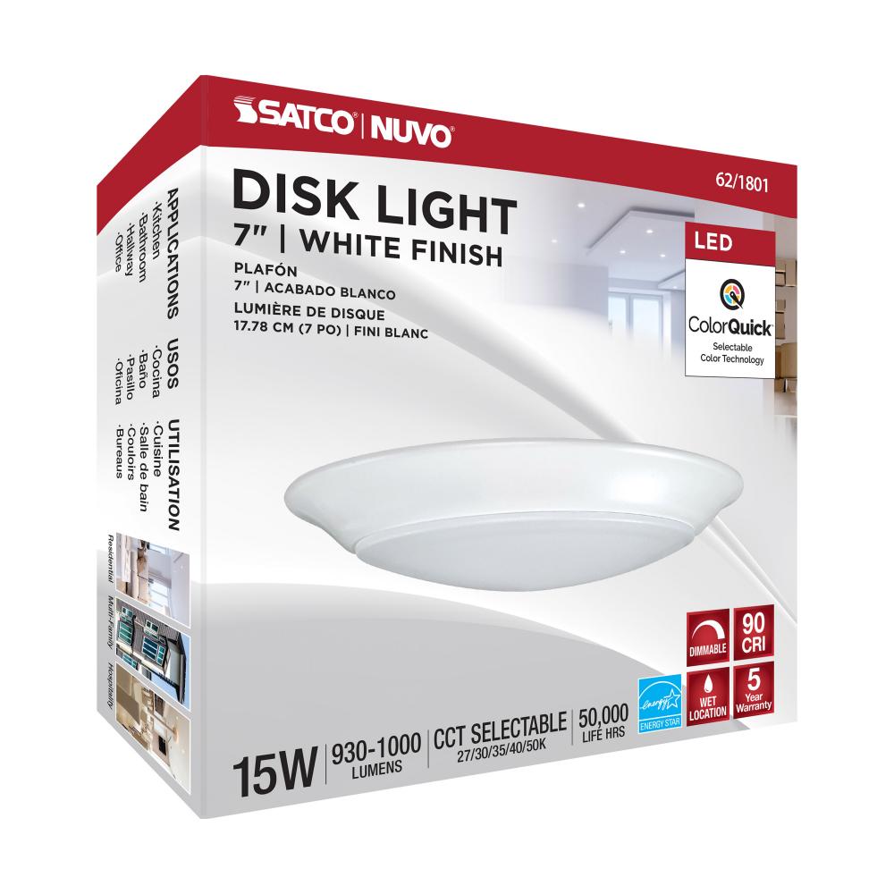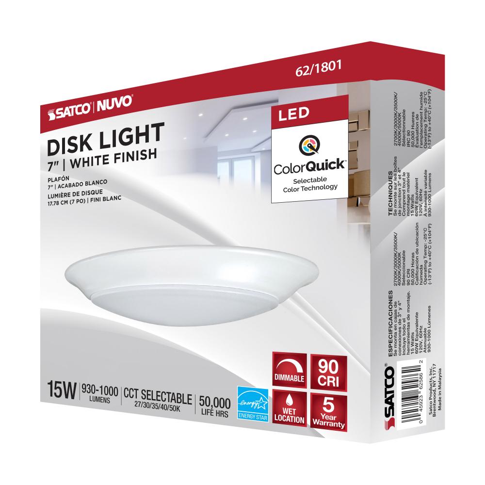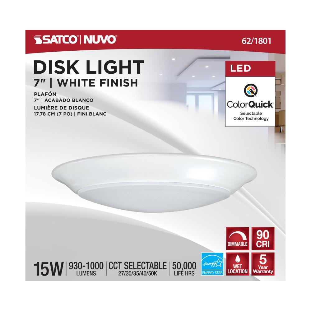 Introducing SATCO NUVO's 62-1801 LED CCT Selectable Disk Light with ColorQuick technology! This 7-inch, 15-watt disk light in white features a high CRI of 93, 2.5kV surge protection, and wet location rating. This CCT Selectable Disk Light is rated for