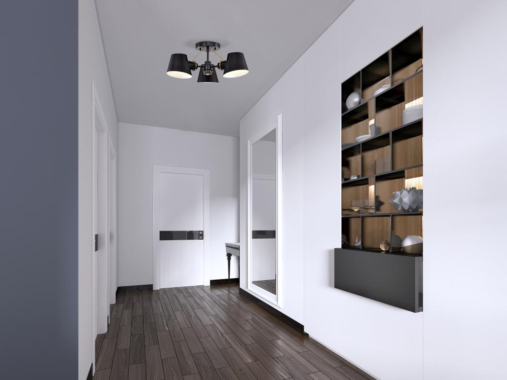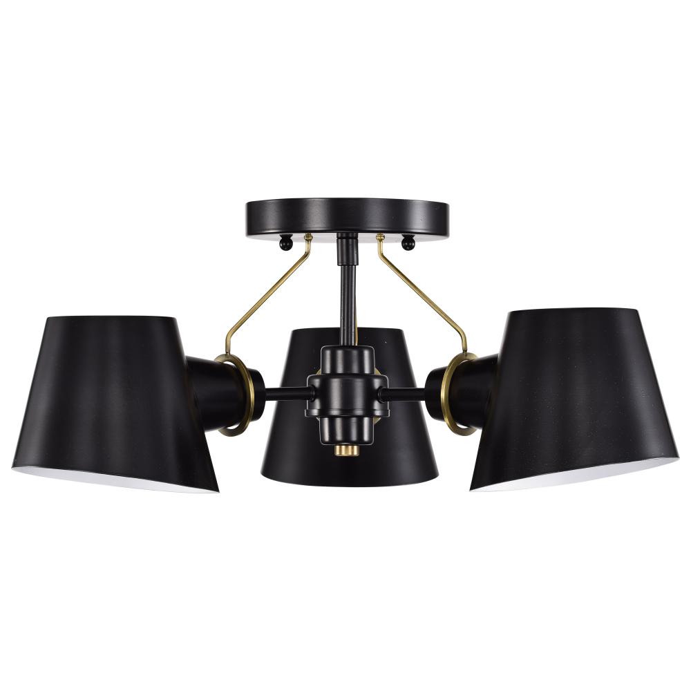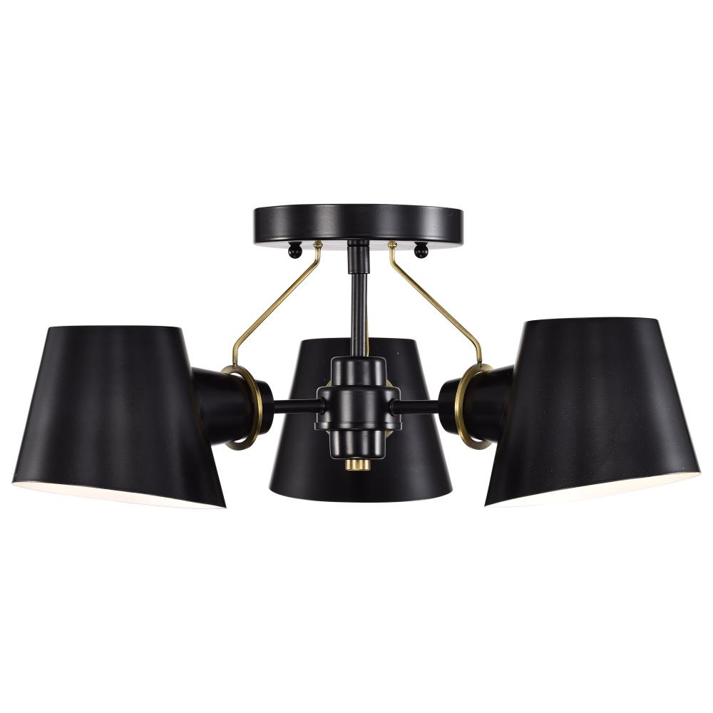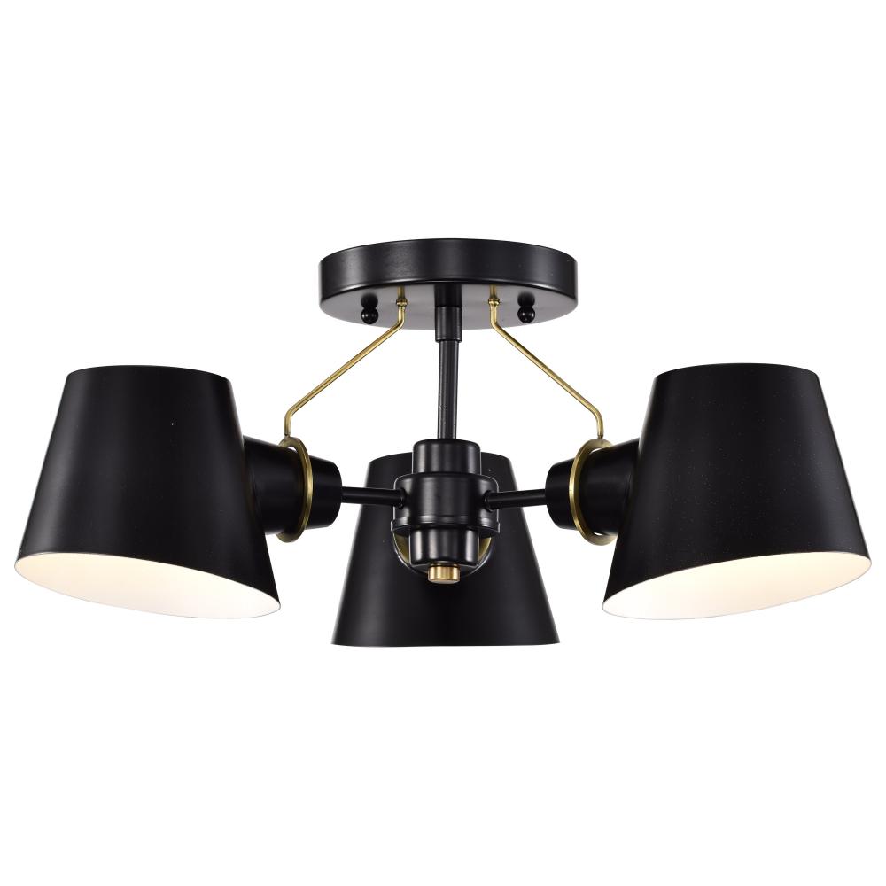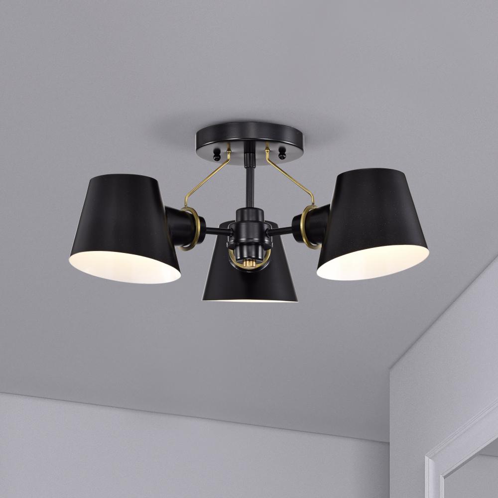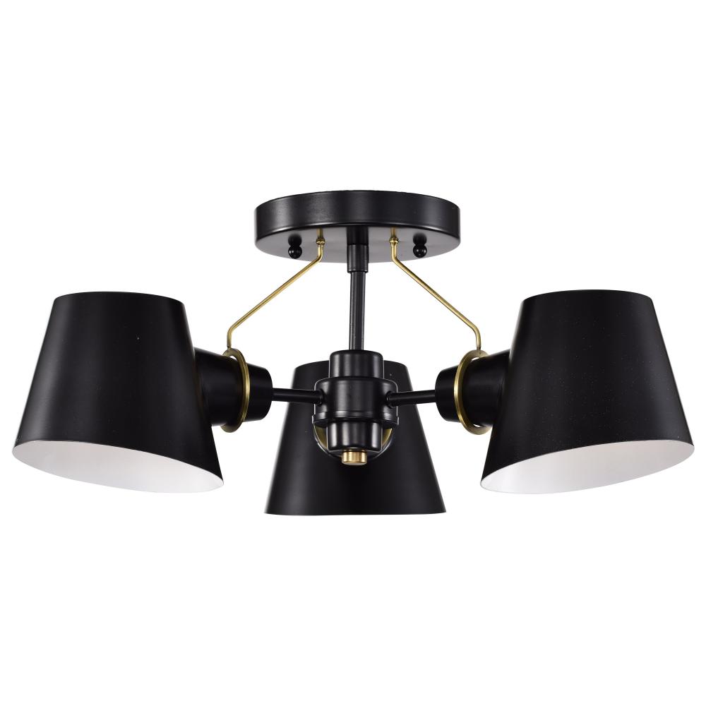 The Baxter semi-flush mount does not disappoint, with its modern design and impressionable style. The black shades are finely cut at an angle and feature a white interior to maximize the light output. The lustrous burnished brass stems attach from the lamp