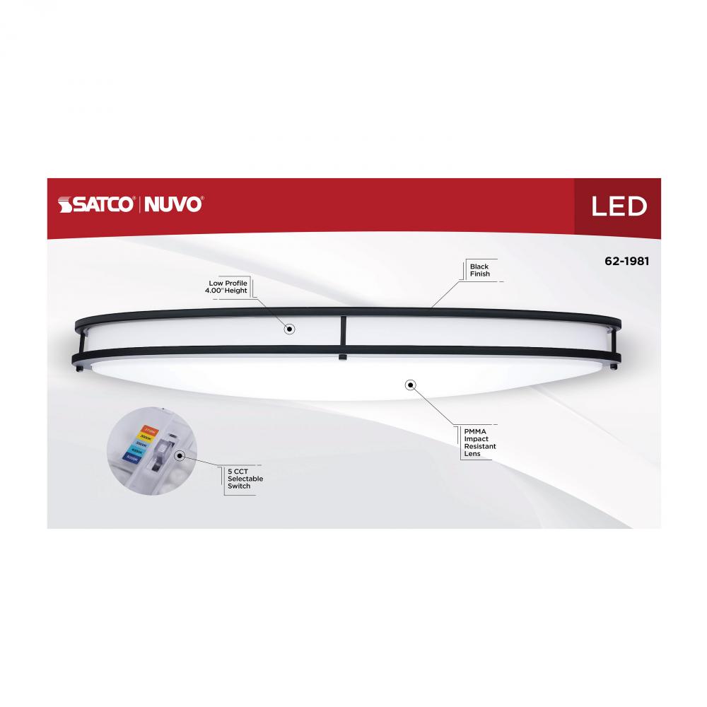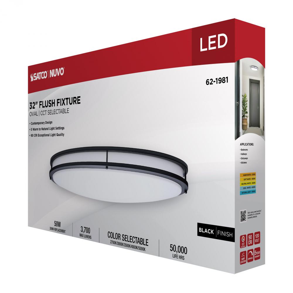 The SATCO NUVO 62-1981 Glamour 32-inch Oval Flush Mount in White with a Black Finish combines modern design with energy-efficient performance, featuring 5 CCT selectable technology (2700K–5000K) and 90 CRI illumination for superior color rendering. This
