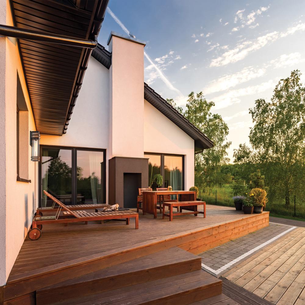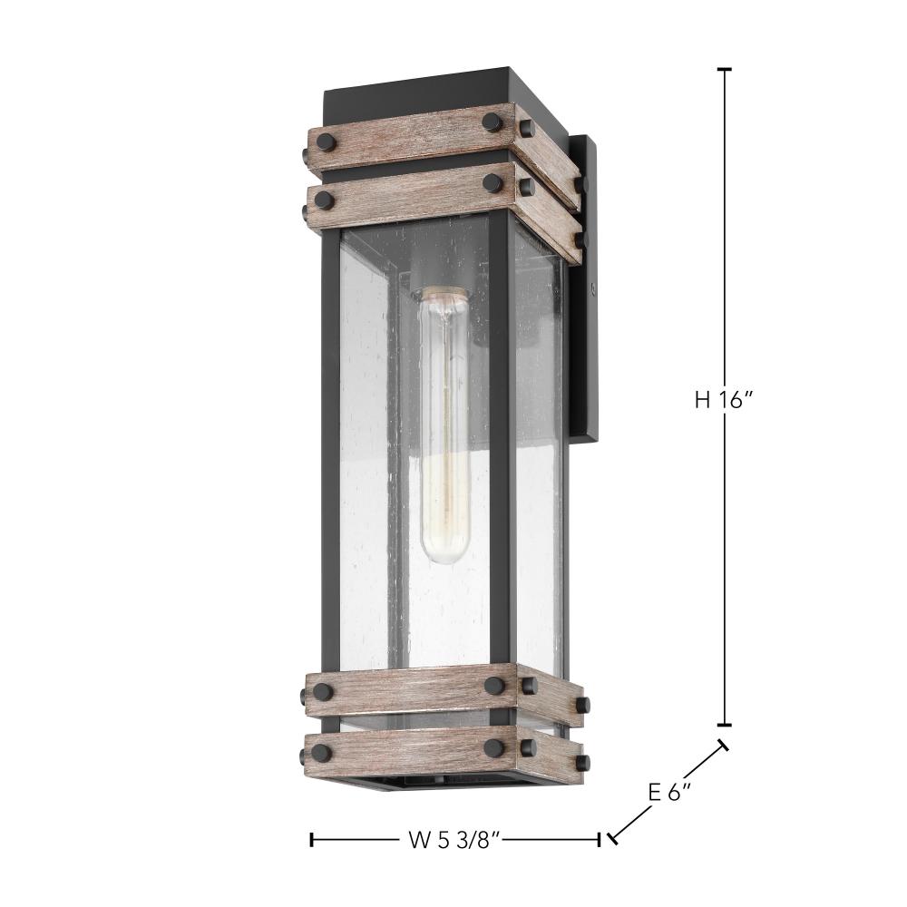 The Homestead 60-7541 medium outdoor wall lantern brings together old and new in a fresh way. The knob fasteners, metal cage, and backplate are finished in a matte black, surrounding the clear seeded glass. Wood-finished bands add visual interest, and when
