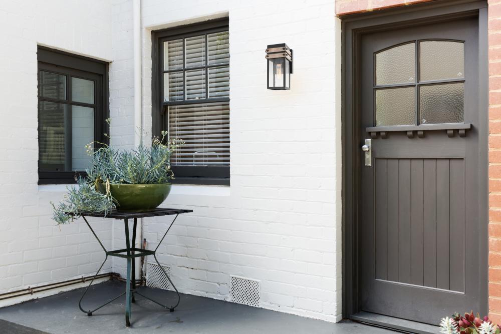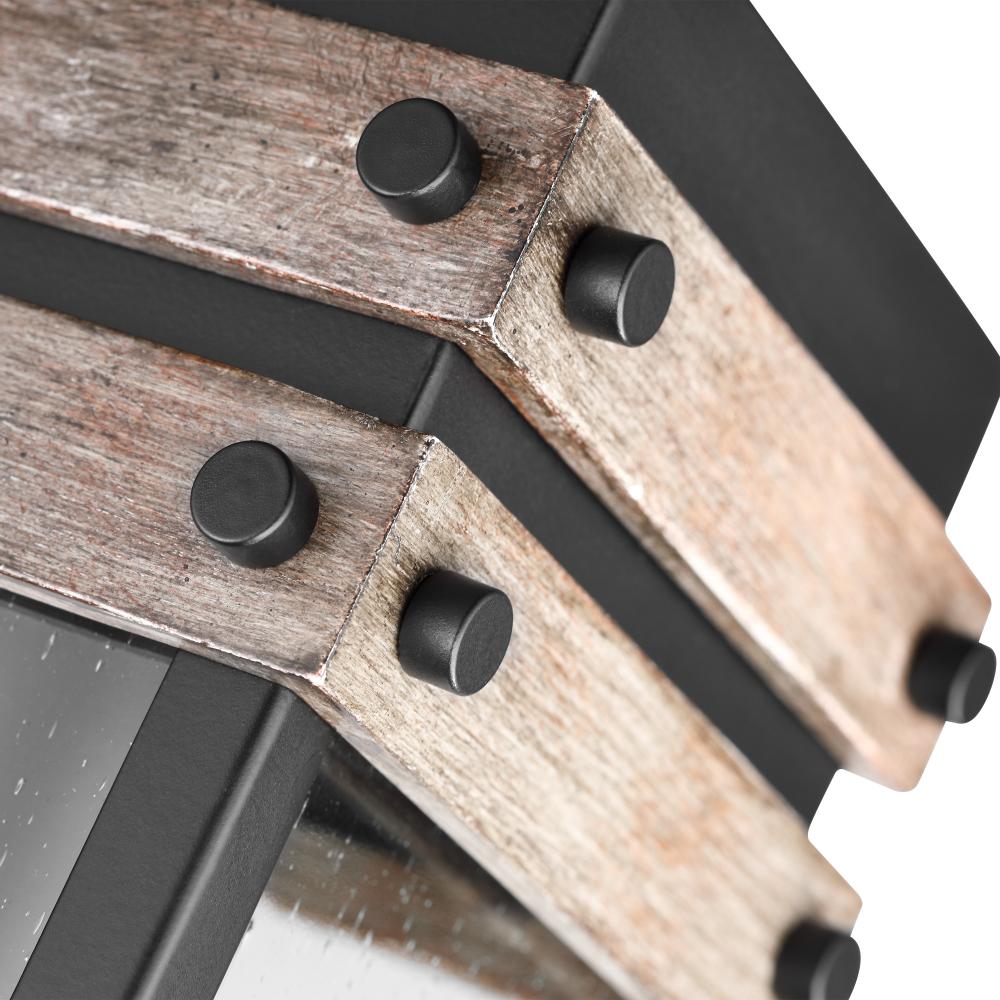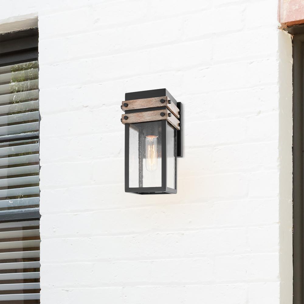 The Homestead 60-7540 small outdoor wall lantern brings together old and new in a fresh way. The knob fasteners, metal cage, and backplate are finished in matte black, surrounding the clear seeded glass. Wood-finished bands add visual interest, and when pa