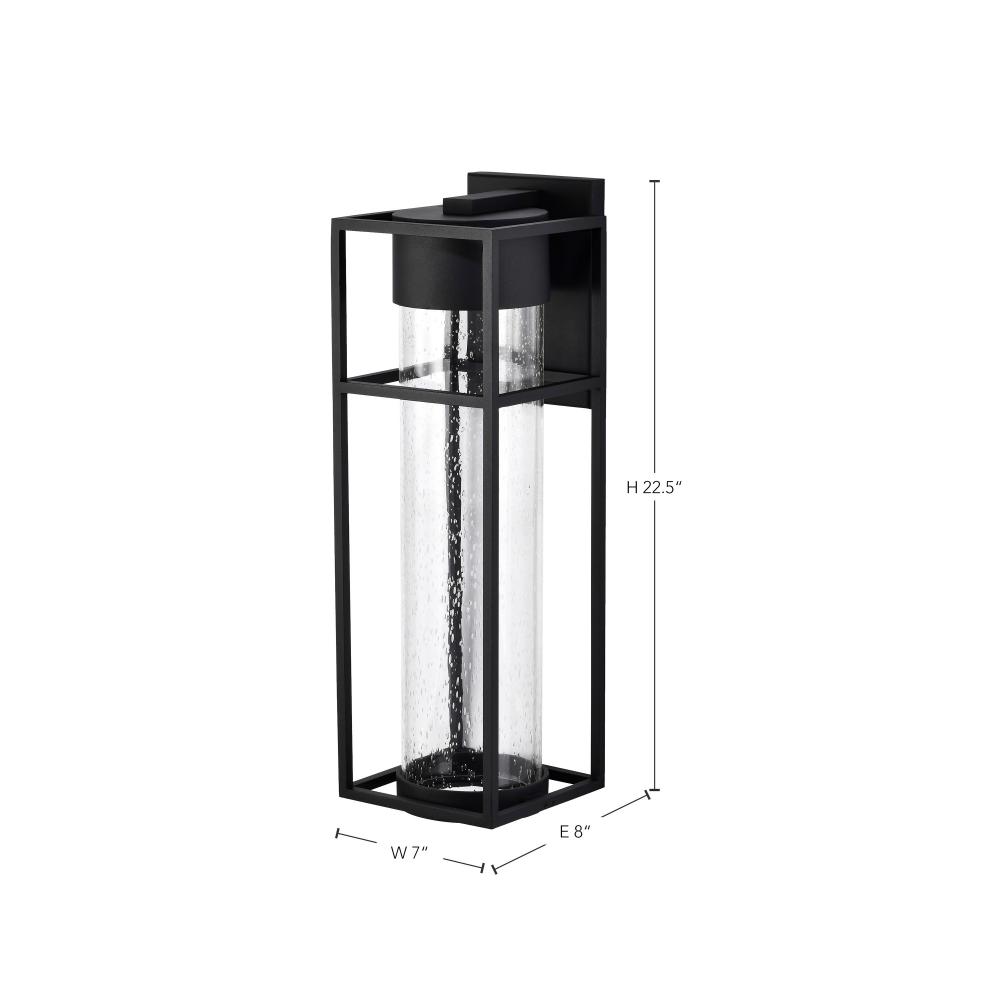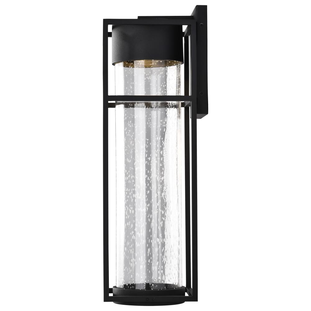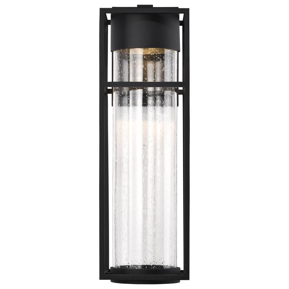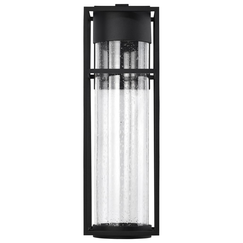 The Ledges LED large outdoor wall lantern blends a simplistic design with great style. The rectangular framework of the fixture is finished in matte black and highlights the cylindrical clear seeded glass housing the integrated LED module. Perfect for mode