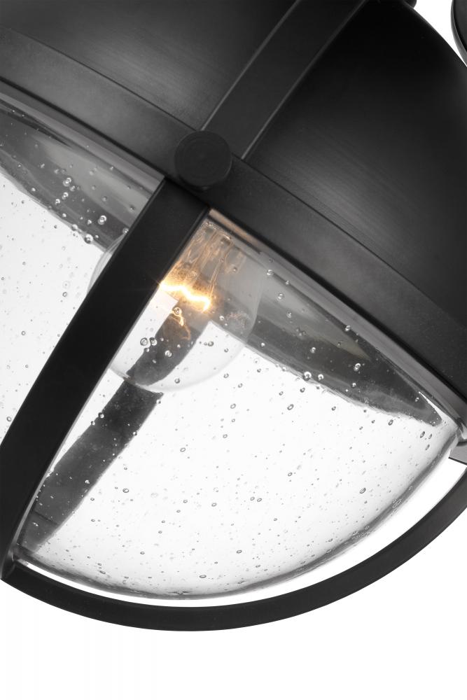 The striking Lincoln 60-7673 semi-flush mount was inspired by an armillary sphere, consisting of a framework of elegant rings. Broad, circular bands surround the orb, and knob details in a matte black finish enhance the clear seeded glass for a prominent,