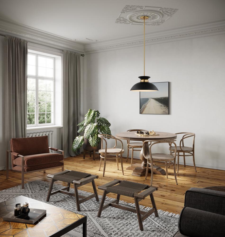 The simplistic design of the Perkins 60-7460 small pendant is understated, yet refined. The decorative burnished brass band on the shallow-dome metal shade cinches at the top, creating the illusion of a swirling skirt. The white interior of the shade provi