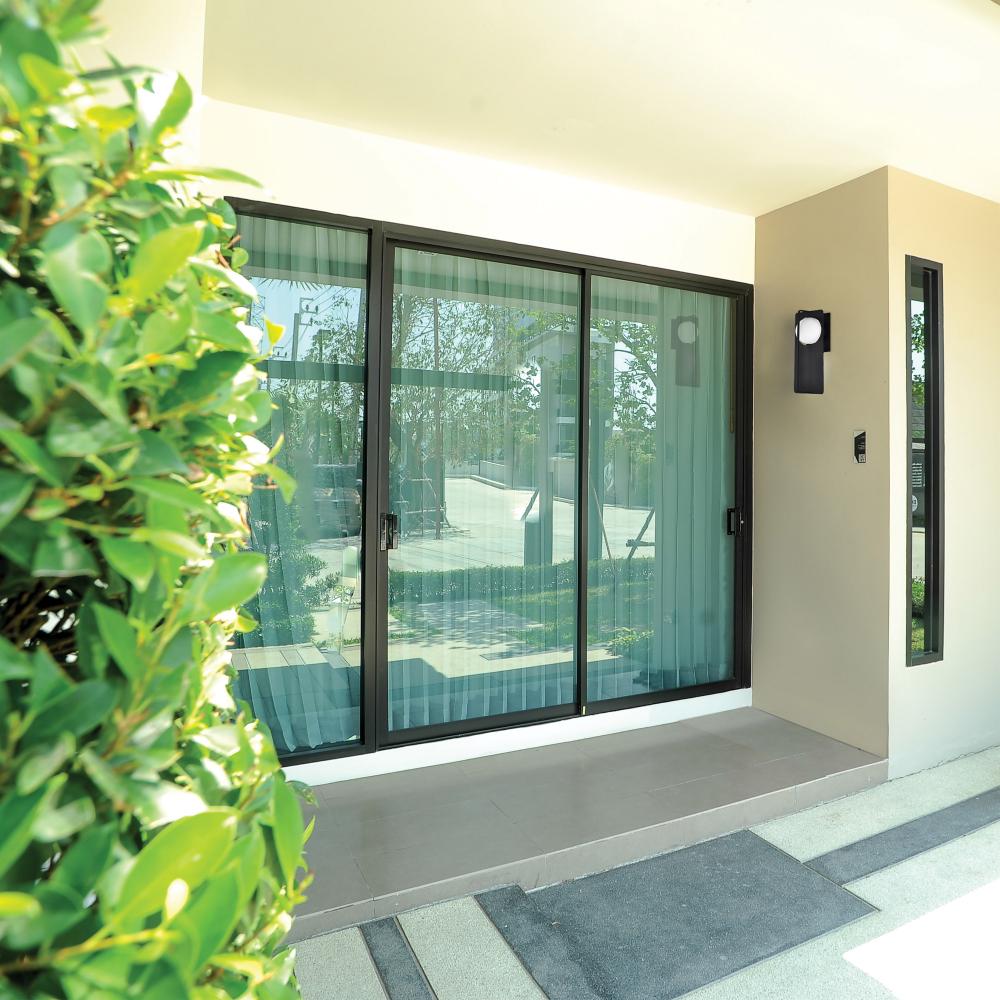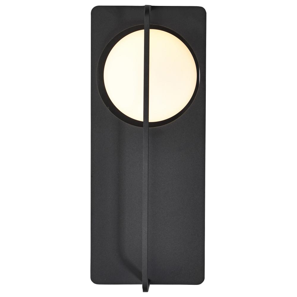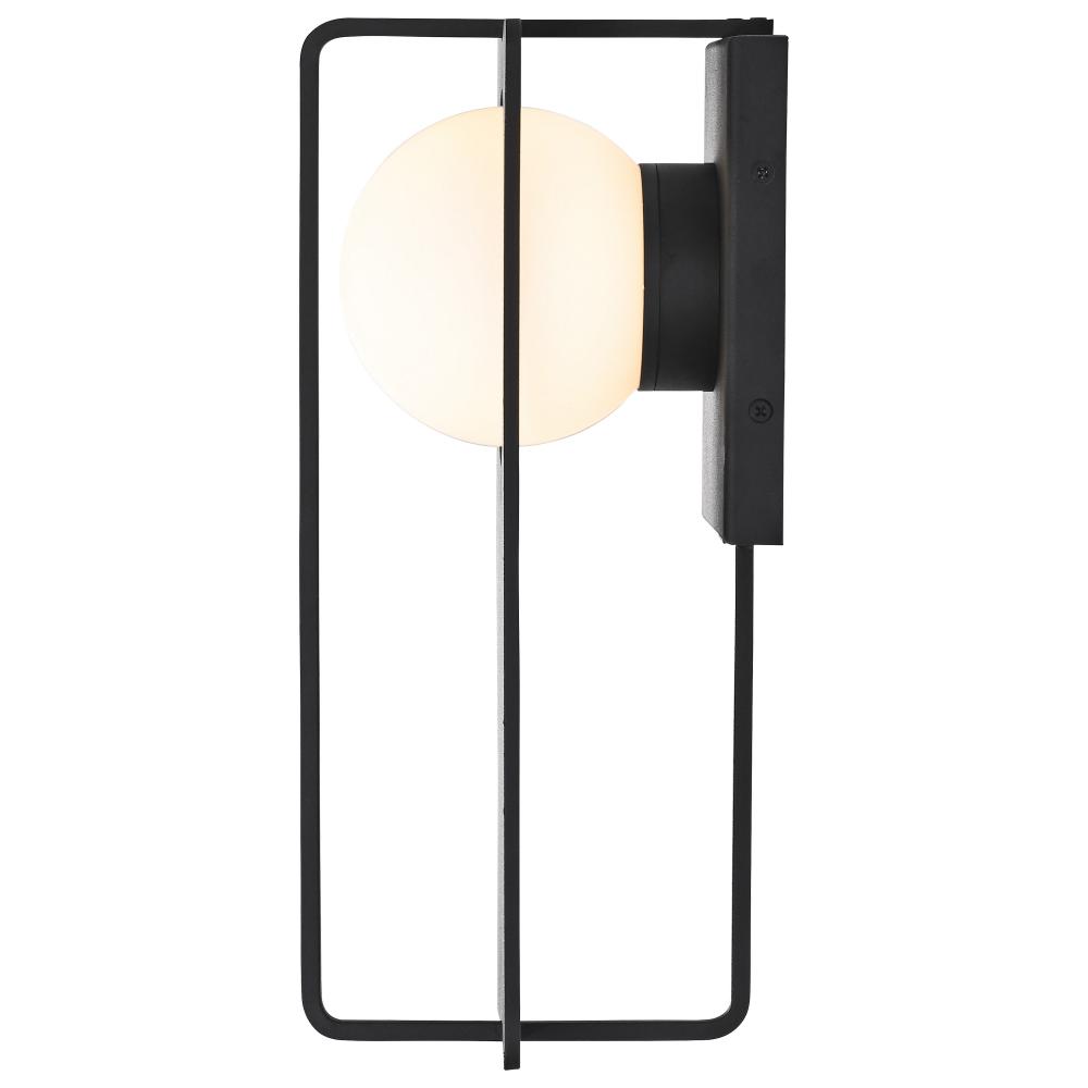 The Portal 62-1609 medium outdoor wall lantern features LED technology and a contemporary, modern design. A single bar spans the length of the fixture with a broad, rectangular plate as the backdrop. A single glass orb appears to float within the fixture a
