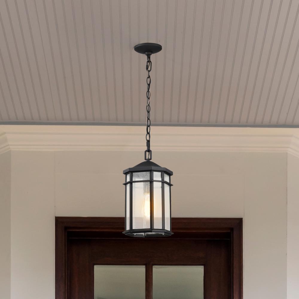 The Raiden 60-5759 Outdoor Hanging Light features a traditional design yet is suited to today's contemporary lighting styles. The clear seeded glass delivers an aged patina softly illuminated by the bulb. The matte black finish showcases the fixture