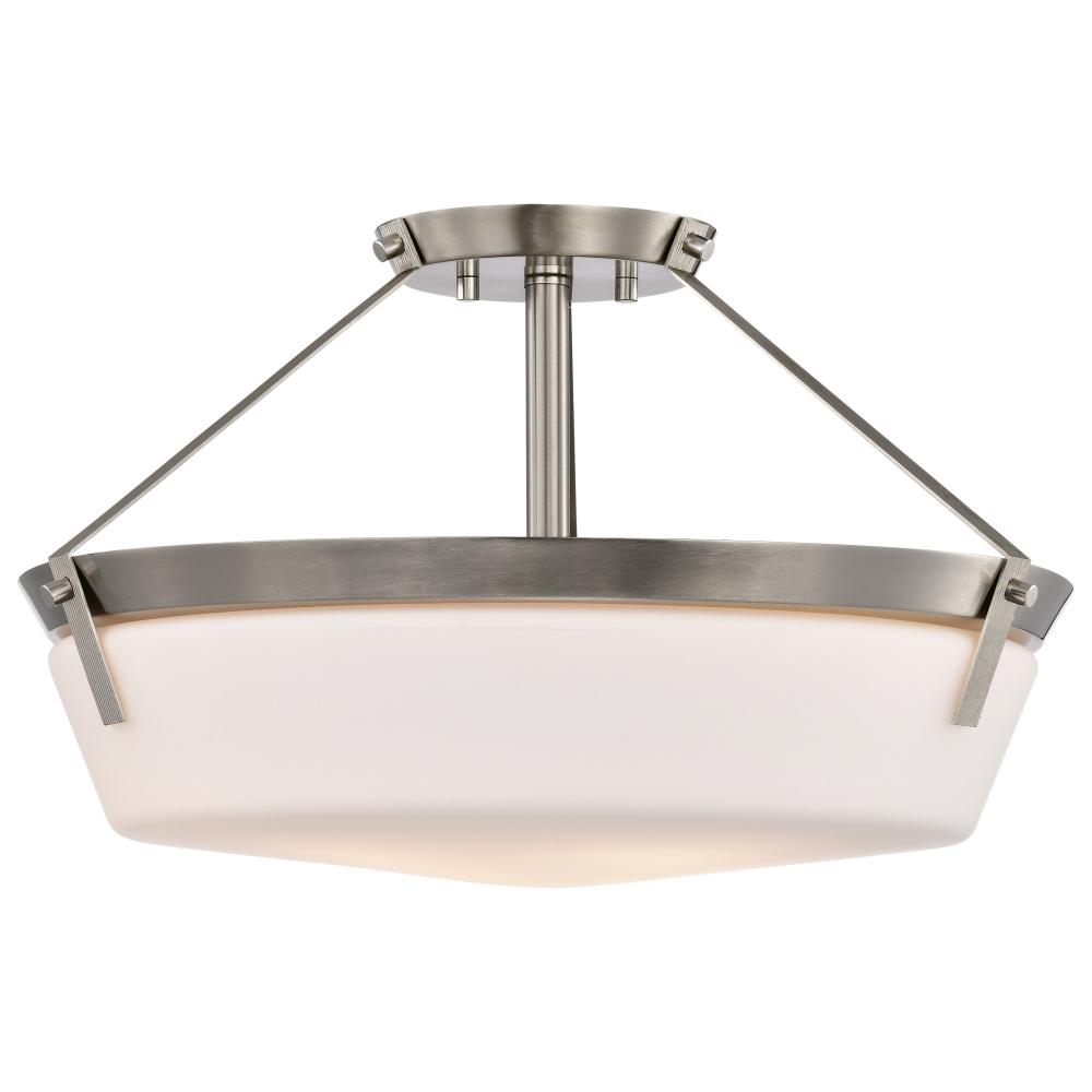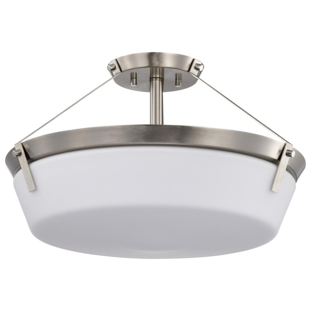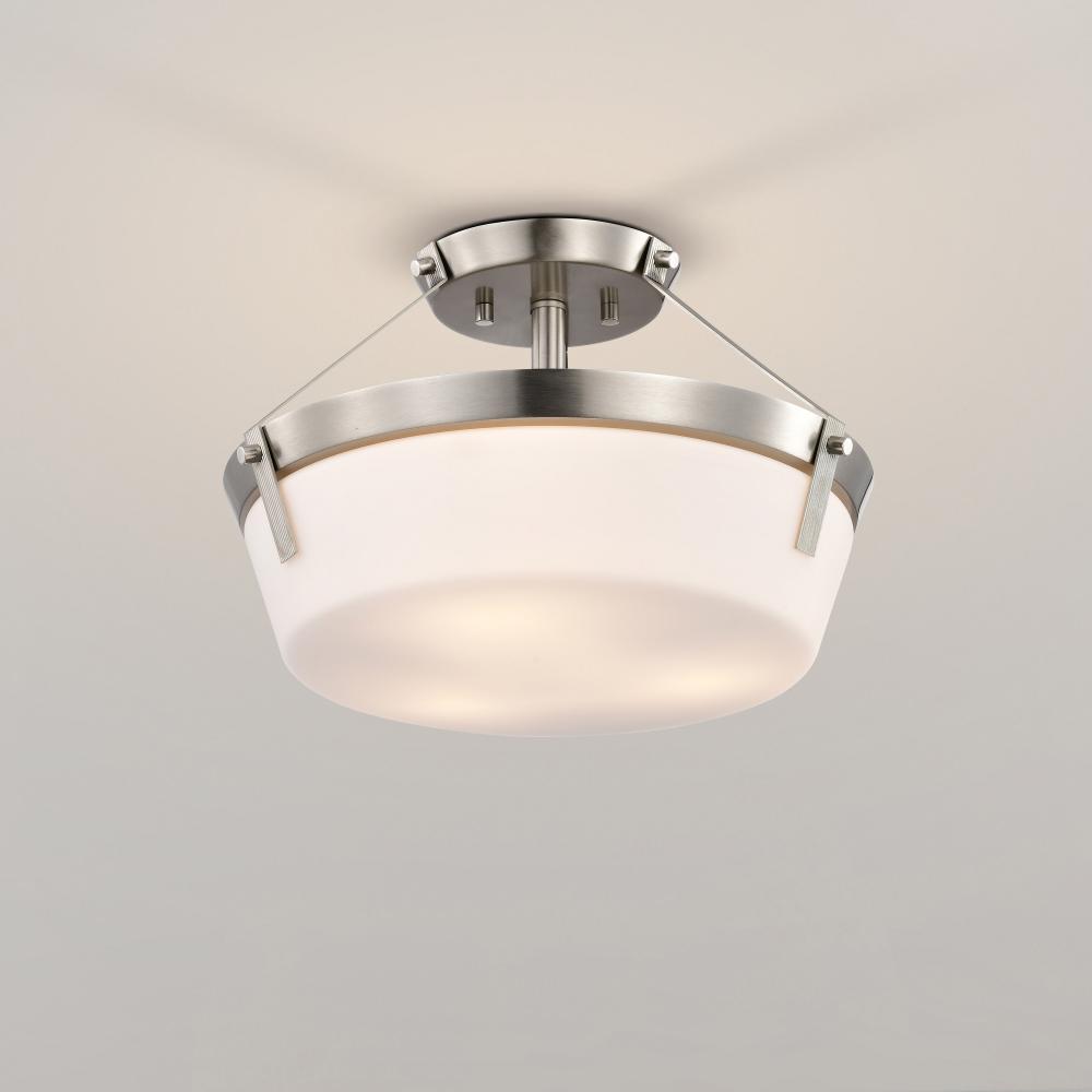 The Rowen 60-7762 semi-flush mount is a versatile lighting fixture that exudes elegance and sophistication. The brushed nickel finish gives the fixture a chic and inviting look, while the etched white glass diffuses the light to create a soft and ambient g