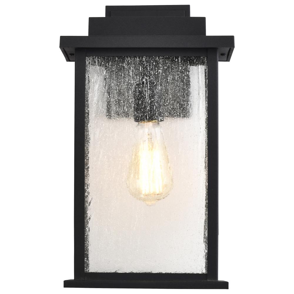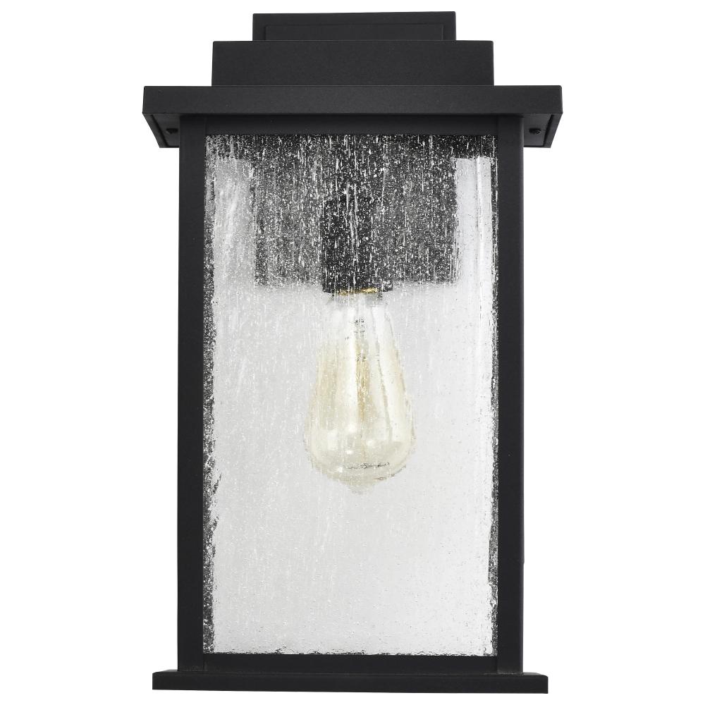 The Sullivan 60-7376 outdoor large wall lantern combines clean lines and minimal details in one flexible design. The seeded clear glass provides subtle diffusion of light and is perfect for lighting the way into your home. The matte black finish works well
