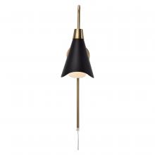 The Tango 60-7467 wall light proves that simple style does not have to be boring. It features burnished brass accents on the backplate, cable cover, and fixture arm, which gives the design some pop. The matte black metal shade is laser-cut on its edge in a